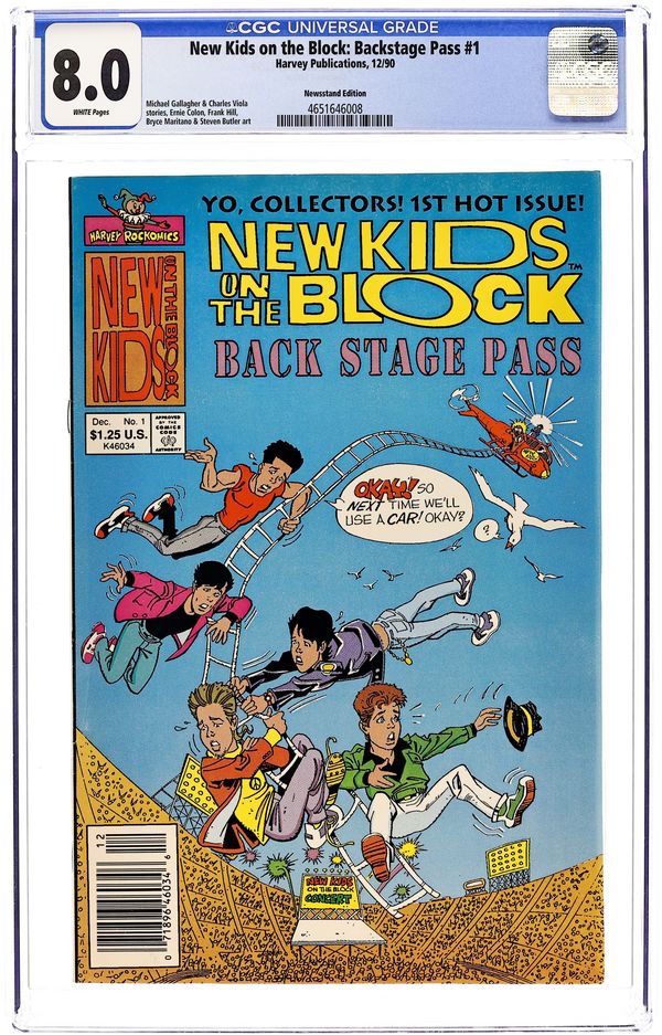 Starts Dec 22 Newsstand Edition. Stories by Michael Gallagher. Art by Ernie Colon and Nate Butler. The New Kids were a pioneering 1990s-era boy band with a huge teen following. In Harvey's New Kids comics, the youthful superstars had misadventures while avoiding the crush of fandom and enjoying worldwide fame. In a story inspired by A Hard Day's Night, the Kids try to escape throngs of female fans. Jordan has a strange dream while composing a new song. The New Kids' new, punk-rock look terrifies their fans. Plus vintage ads for the New Kids' fan club, merchandise and 1-900 fan hotline. Sleepless Knights; A Jordan Knightmare; Two On One; Scared Silly. 32 pages, Full Color. Cover price $1.25. Grade: CGC 8.0 explanation of grade Condition: Used (collectible)