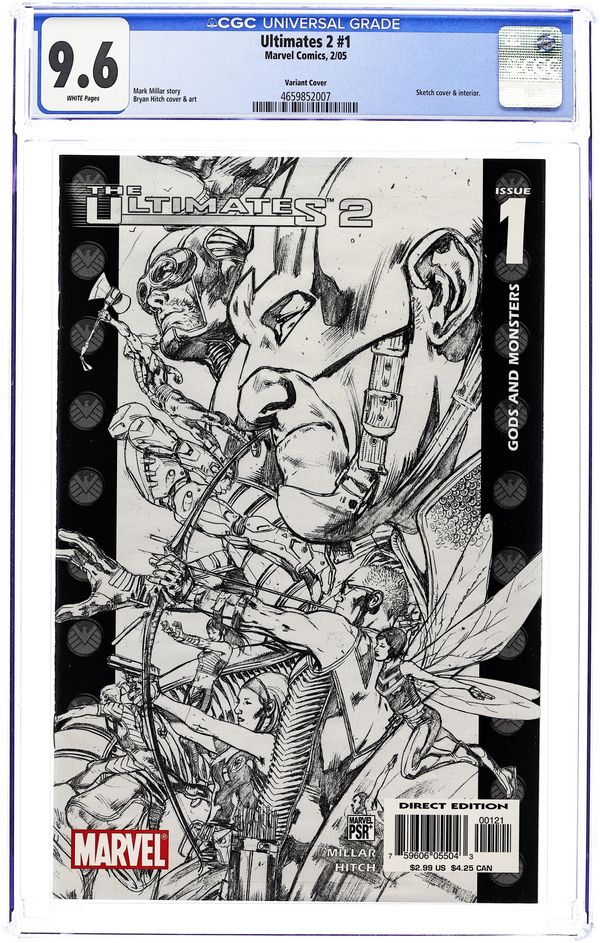 Starts Dec 22 Retailer Incentive Sketch Cover. Written by Mark Millar Pencils & Cover by Bryan Hitch PART 1 (OF 5) The ULTIMATES return in this BLOCKBUSTER first issue! It's been one year since they stopped an alien invasion, and now things get hard. New members, new costumes and 12 months of gossip to catch up on! Who's getting married? Who's divorced? Who's gone nuts since we last saw them? Why, just in this first arc we see Ultimate Hulk, the secret origin of Ultimate Thor, and we get a look at the entire Ultimate Universe as drawn by Bryan Hitch! It's guest-stars galore, with everyone from the X-Men, Daredevil, Captain Britain and even The Defenders. Why are you reading this? Go reserve a copy NOW! 32 PGS./MARVEL PSR+ ...$2.99 UPC: 5960605504-00111 RETAILERS: See the Diamond Order Form for details on the special 50/50 sketch variant! Cover price $2.99. Grade: CGC 9.6 explanation of grade Condition: Used (collectible)