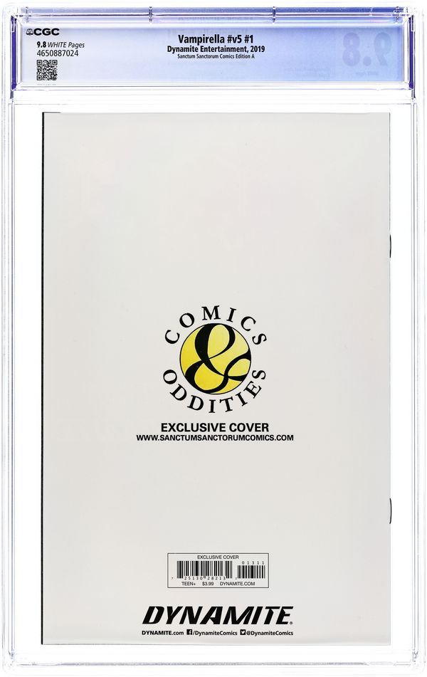 Sanctum Sanctorum Comics and Oddities Exclusive Virgin Cover by Elias Chatzoudis. Written by Christopher Preist. Art by Ergun Gunduz. In July 1969, the world was first introduced to Vampirella. 50 years later, she doesn't look a day older!!!! Now, to celebrate her gold anniversary, Dynamite is launching a brand-new, ongoing series featuring the talents of Christopher Priest (Black Panther, Deathstroke, Quantum & Woody, Justice League) and European star/American star-in-the-making, Ergün Gündüz (Tales of the Great War, Taxi Tales)! 32 pages, full color. Rated T+ Grade: CGC 9.8 explanation of grade Condition: Used (collectible)