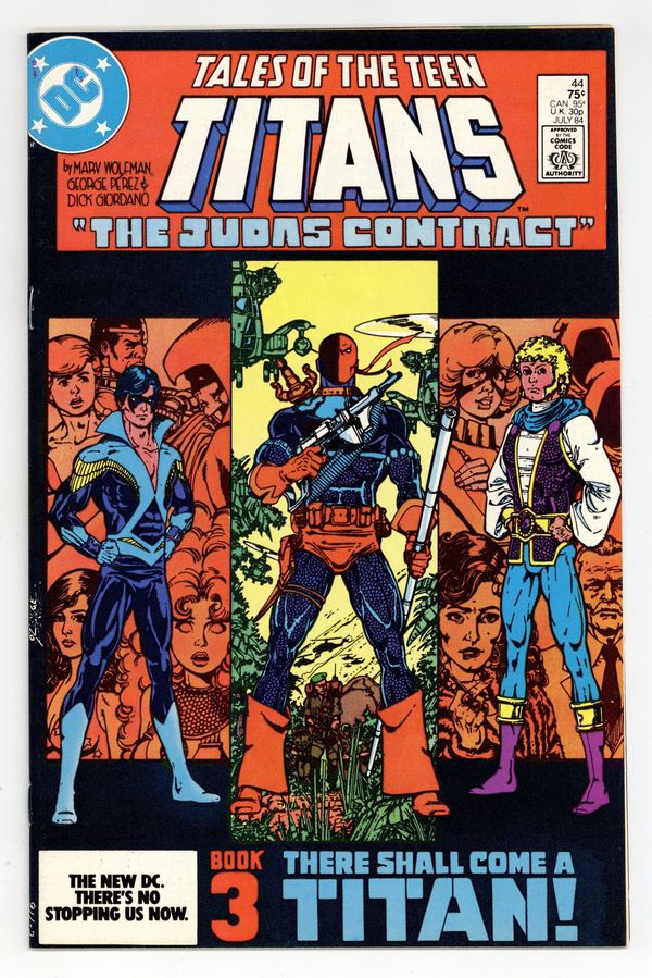 Direct Edition. The Judas Contract: Part 3 of 4: There Shall Come a Titan! - Written by Marv Wolfman & George Perez. Art by George Perez, Dick Giordano and Mike DeCarlo. Cover by George Perez. Adeline Wilson tells Dick Grayson of the origin of Deathstroke, and Dick assumes the name Nightwing for the first time! Starring Nightwing (intro), Jericho (intro), Deathstroke the Terminator, Terra, Adeline Wilson, H.I.V.E., Wintergreen, Grant Wilson (flashback/cameo) and Jackal. Concludes in New Teen Titans (1980) Annual #3. 36 pages, full color. Cover price $0.75. Grade: FN/VF 7.0 explanation of grade Condition: Used (collectible)