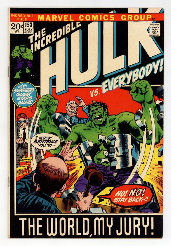 Cover pencils by Herb Trimpe, inks by John Severin. The World, My Jury!, script by Roy Thomas and Gary Friedrich, pencils by Dick Ayers (pages 1-17) and Herb Trimpe (pages 18-21 and Avengers and Iron-Man figures on pages 15-16), inks by John Severin; On a runway at JFK airport, Mr. Fantastic brings the Hulk down with his newly devised Nega-Gamma Gun; The Hulk is placed in heavy restraints and is put on trial for his crimes; After testimony in the case, both pro and con, Matt pulls a stunt out of his lawyer's bag of tricks and quickly proves that the Hulk is too mentally incompetent to stand trial; As the judge tries to figure out how to proceed, Reed shows up with his special gun and claims it will change the Hulk into Bruce Banner for good; Instead, it provides the Hulk with the strength to break free and escape. Letter from comics writer Mike W. Barr. 36 pgs. $0.20. Cover price $0.20. Grade: VG/FN 5.0 explanation of grade Condition: Used (collectible)