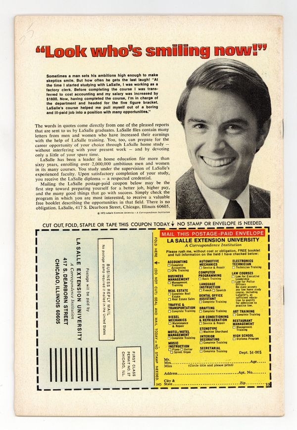 Cover inks by Frank Giacoia. Now Strikes the Sub-Human, script by Roy Thomas, pencils by Don Heck, inks by George Tuska; the X-Men battle the Grotesk, the last survivor of the Sub-Humans; reprinted from issue 41. For the Rest of Your Life!, script by Stan Lee, art by Steve Ditko; Jupiter's courts are thought soft, but their convicts are actually imprisoned for life within an illusion of freedom; reprinted from Amazing Adult Fantasy #11. 36 pgs. $0.25. Cover price $0.25. Grade: FN- 5.5 explanation of grade Condition: Used (collectible)