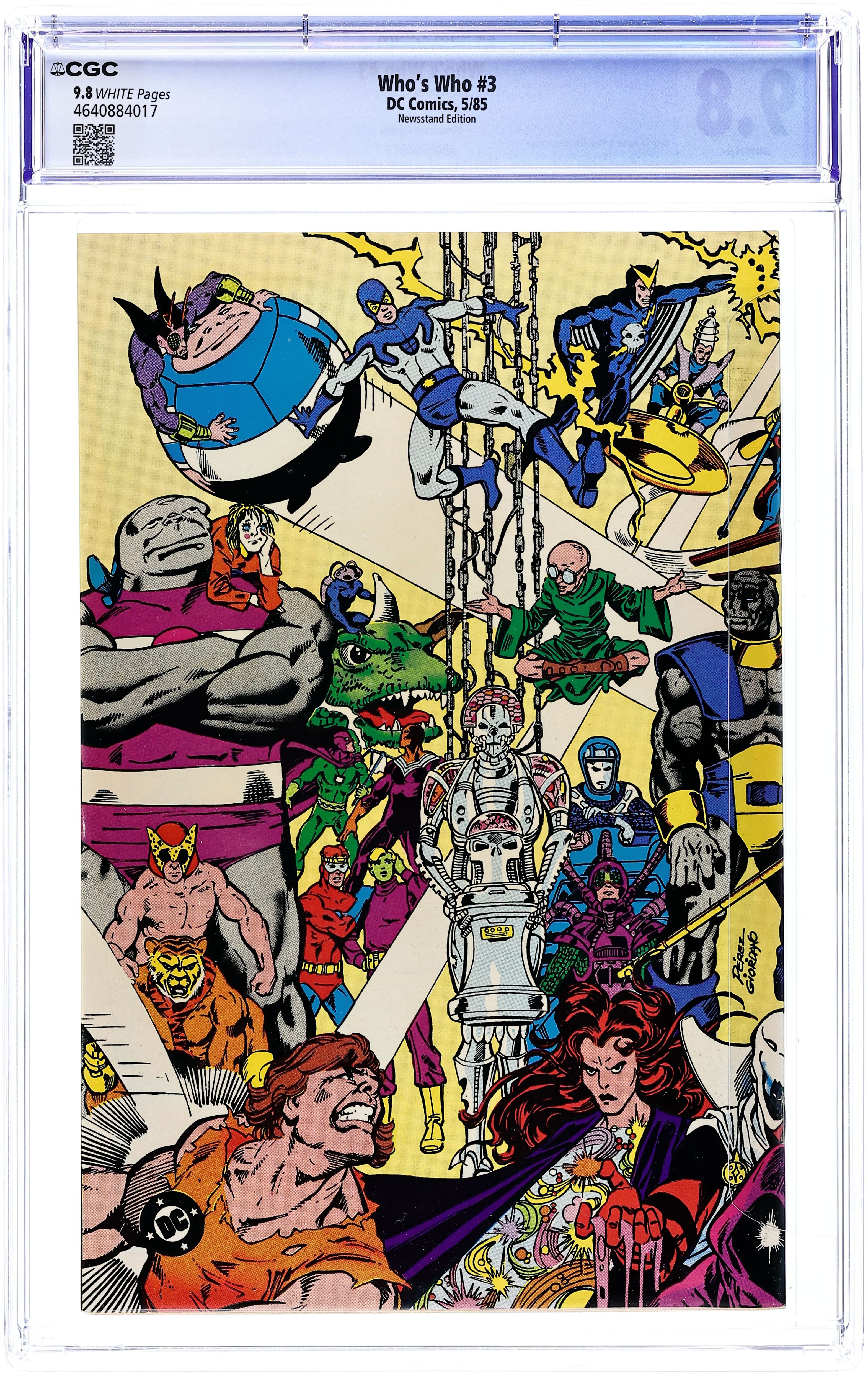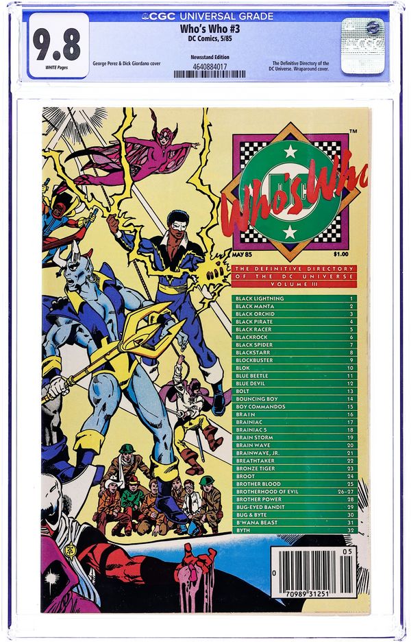 Newsstand Edition. Written primarily by Len Wein and Marv Wolfman (with research by E. Nelson Bridwell and others), Who's Who is a meticulously detailed, alphabetically arranged series of reference volumes that provides personal data, history, and powers and weapons for countless DC characters, both popular and obscure, both new (circa mid 1980s) and old. Volume three has entries for Black Lightning, Blue Beetle, Boy Commandos, Brainiac, and many others. Character renderings are by such artistic greats as Gil Kane, George Perez, Jim Aparo, Curt Swan, Jack Kirby, Michael T. Gilbert, and Steve Rude. FULL DETAIL: 3 - Character/artist listing: Black Lightning by Jim Aparo; Black Manta by Bill Willingham and Romeo Tanghal; Black Orchid by Terry Austin; Black Pirate by Jerry Ordway; Black Racer by Jack Kirby and Greg Theakston; Blackrock by Curt Swan and Murphy Anderson; Black Spider by Pat Broderick; Blackstarr by Carmine Infantino and Rick Magyar; Blockbuster by Michael T. Gilbert; Blok by Steve Lightle; Blue Beetle by Steve Rude; Blue Devil by Paris Cullins and Gary Martin; Bolt by Paris Cullins and Gary Martin; Bouncing Boy by Keith Giffen and Karl Kesel; Boy Commandos by Jack Kirby and Greg Theakston; Brain by Bill Sienkiewicz; Brainiac by Ed Hannigan and Mike DeCarlo; Brainiac 5 by Curt Swan and Karl Kesel; Brain Storm by Curt Swan and Al Williamson; Brain Wave by Joe Staton; Brainwave Jr. by Jerry Ordway; Breathtaker by Rafael Kayanan; Bronze Tiger by Denys Cowan and Frank Giacoia; Broot by Shawn McManus; Brother Blood by George Perez; Brotherhood of Evil by George Perez; Brother Power by Valentino and Karl Kesel; Bug-Eyed Bandit by Gil Kane; Bug & Byte by Rafael Kayanan and Bob Smith; B'Wana Beast by Chuck Patton and Rick Magyar; Byth by Joe Kubert. George Perez/Dick Giordano cover. Cover price $1.00. Grade: CGC 9.8 explanation of grade Condition: Used (collectible)