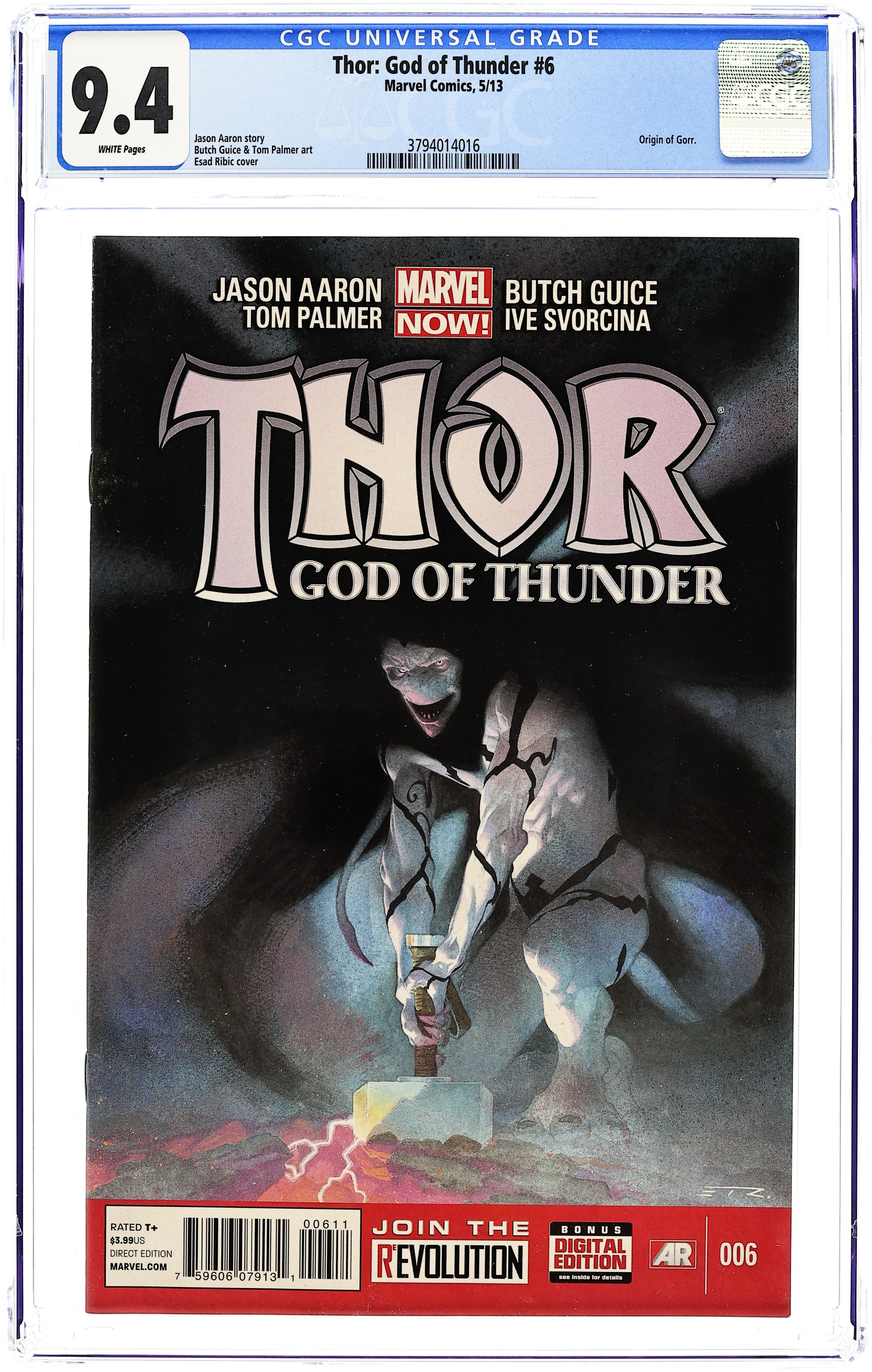 WHAT THE GODS HAVE WROUGHT (W) Jason Aaron. (A) Butch Guice, Tom Palmer. (CA) Esad Ribic. In a chilling interlude, discover the dark origin of Gorr...and the truth behind his bloody quest to butcher the gods. Cover price $3.99. Grade: CGC 9.4 explanation of grade Condition: Used (collectible)
