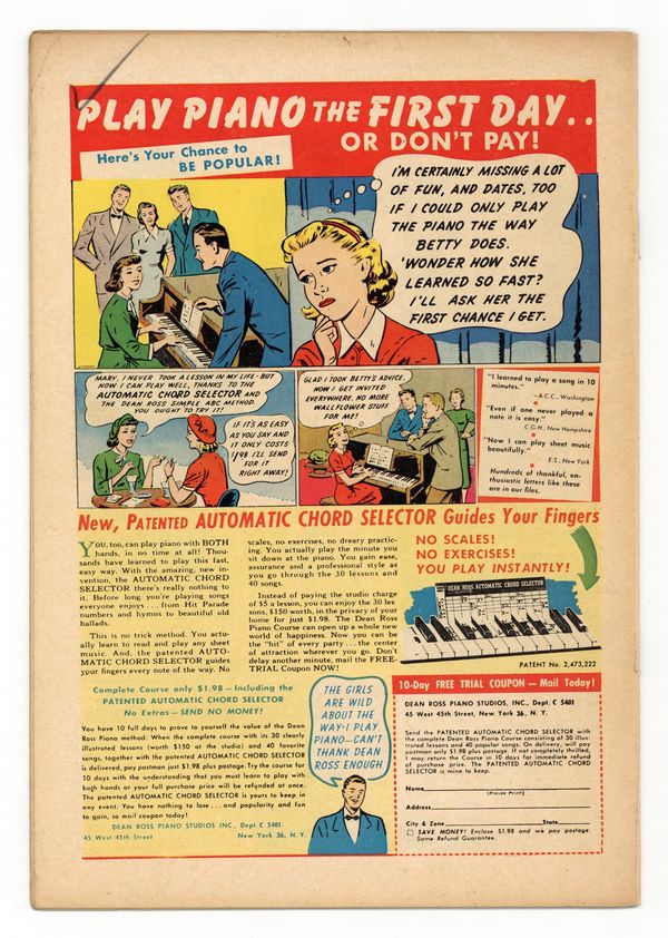 Painted cover by Dawson. Stories and art by Ric Estrada and Hy Rosen. Tales of teen angst and amour. Farm girl Helen falls for hitchhiker Doug and follows him back to the city, where she learns how different they really are. Patty joins a sorority at her new college, but her initiation prank involves in a conspiracy to sabotage the football team. Cowboy Rance wants to join the professional rodeo circuit in New York City (!), forcing Vicki to choose between him and the ranch that she loves. Bewitched and Bewildered; What Every Girl Should Know; Love in Disguise; Lighter Side; Have You Heard This One?; A Colt Called Cupid. 32 pages, Full Color. Cover price $0.10. Grade: VG/FN 5.0 explanation of grade Condition: Used (collectible)