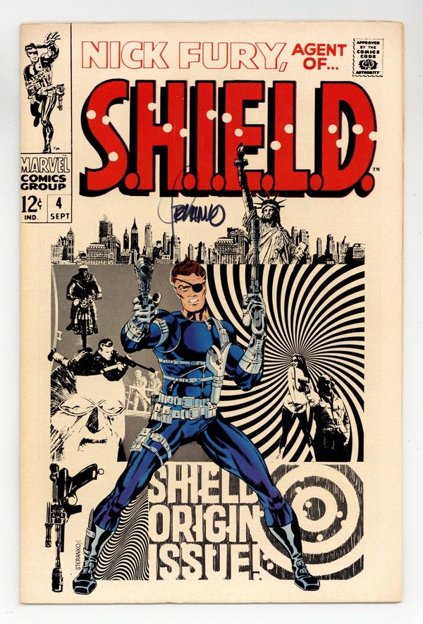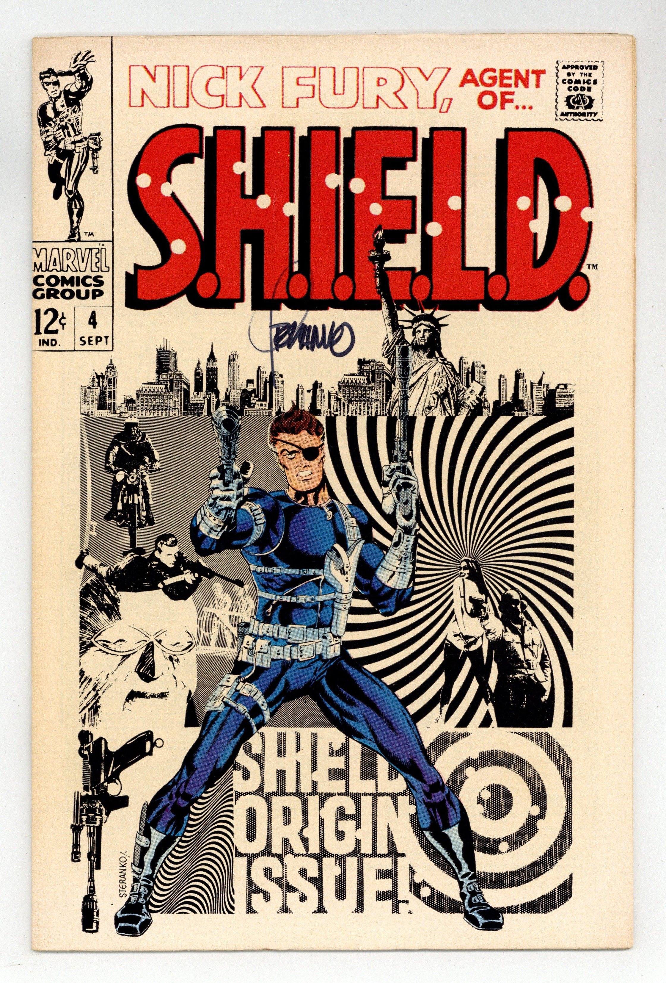 Starts Apr 4 Cover by Jim Steranko. SHIELD origin retold in "And Now It Begins...', script by Roy Thomas (plot, dialogue) and Frank Springer (plot), art by Frank Springer; HYDRA repeatedly tries to murder Nick Fury before he can recruited to head SHIELD; The agent in charge of the operation, Agent L, is executed for his failure by Agent H; After reminiscing about his days in WW2, Fury meets Tony Stark, who introduces him to the SHIELD board of directors, then shows him a film detailing HYDRA's operations; After Fury uncovers a bomb in the room and dispatches it, along with the spy who planted it, he realizes the danger facing the free world and takes the job. Frank Springer's 1st Marvel work. 36 pgs., full color. $0.12. Cover price $0.12. Grade: FN 6.0 explanation of grade Condition: Used (collectible)