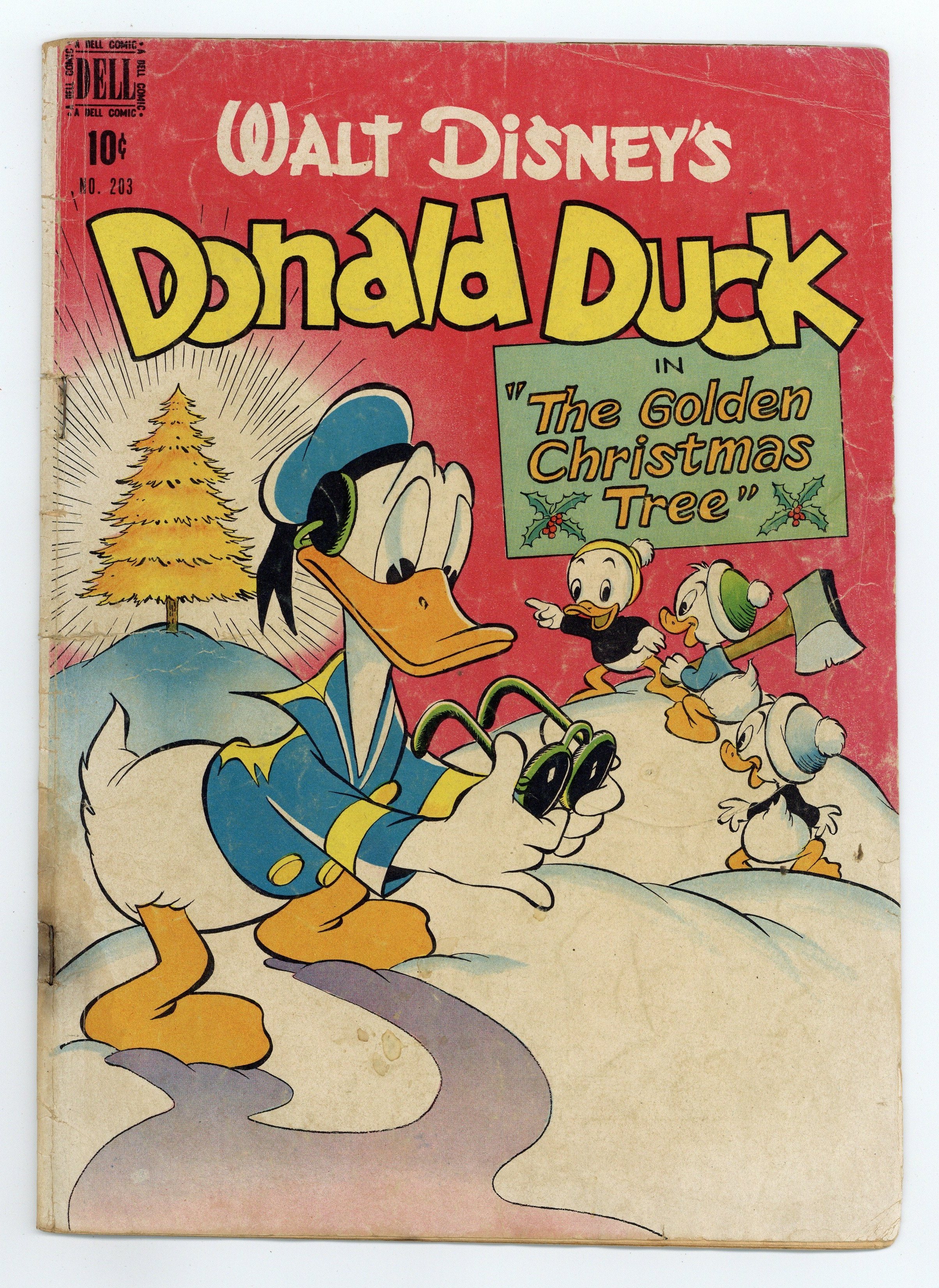 Indicia title is Walt Disney's DONALD DUCK in THE GOLDEN CHRISTMAS TREE, No. 203. The Golden Christmas Tree, art by Carl Barks; The nephews, disappointed in their wish for a golden Christmas tree, are lured into a trap by a witch who plans to use their tears in a magic potion that will destroy all the Christmas trees on earth. Special Delivery, script and art by Bill Wright; Santa sprains his ankle when he visits Mickey's house on Christmas Eve; Mickey and Goofy deliver the presents on the few remaining stops on Santa's list, but not without a number of accidents. The True Test one-page strip, script and art by Carl Barks; Donald tests toys to see how sturdy they are. Ornaments on the Way one-page strip, script and art by Carl Barks. 36 pages, full color. Cover price $0.10. Grade: PR 0.5 explanation of grade Condition: Used (collectible)