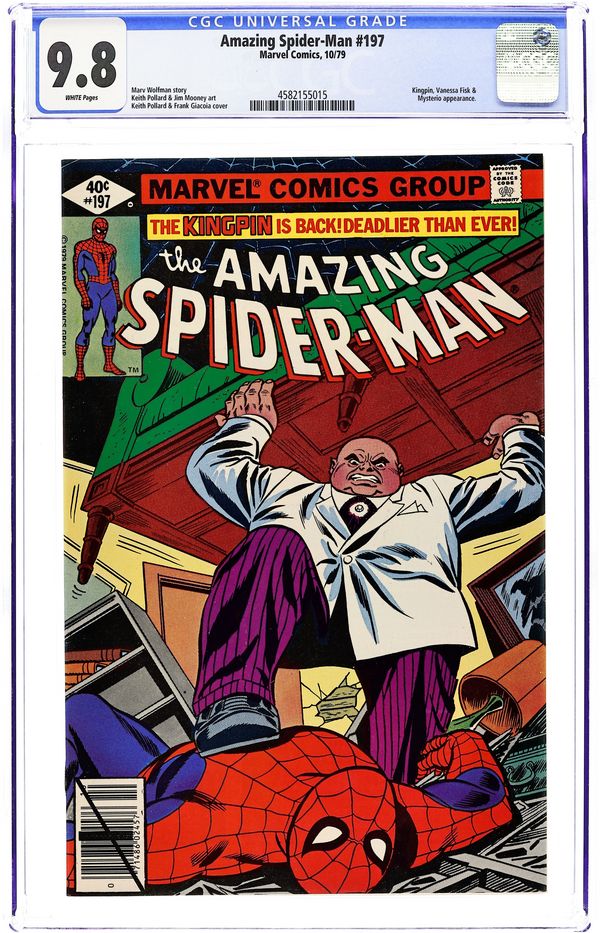 Direct Edition. "The Kingpin's Midnight Massacre!" Script by Marv Wolfman. Art by Keith Pollard (layouts) and Jim Mooney (finishes). Cover by Keith Pollard and Frank Giacoia. One of wall-crawler's best battle issues of the bronze age! The Amazing Spider-Man and the Kingpin of Crime fight from cover to cover and then some! To the web-slinger's chagrin, the Kingpin survived his plunge into the river (at the end of Amazing Spider-Man 164)! And now the over-sized crime boss has only one task left before retiring from his life of crime: destroy his long-time web-slinging foe! However Vanessa Fisk has told her husband to finish the job before midnight! So the Kingpin is working against a deadline, while the wall-crawler is just trying to run out the clock! An outstanding issue! Cameo appearances by Mysterio (in civilian clothes) and the burglar. (Notes: This issue marks a major turning point for the Kingpin. The popular super-villain transitions into Frank Miller's Daredevil title to become a major antagonist of the Man Without Fear beginning in Daredevil 170 & 171.) 36 pages. Cover price $0.40. Grade: CGC 9.8 explanation of grade Condition: Used (collectible)