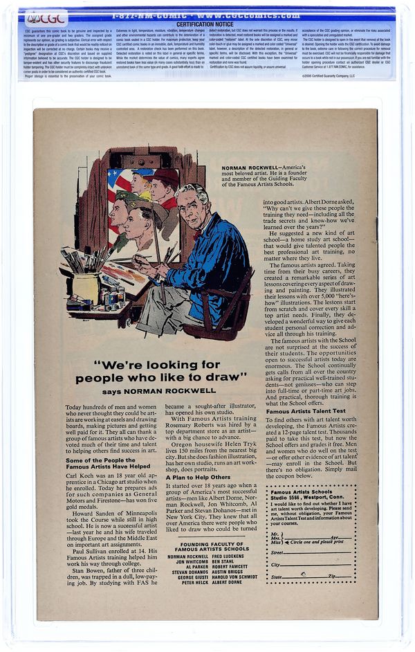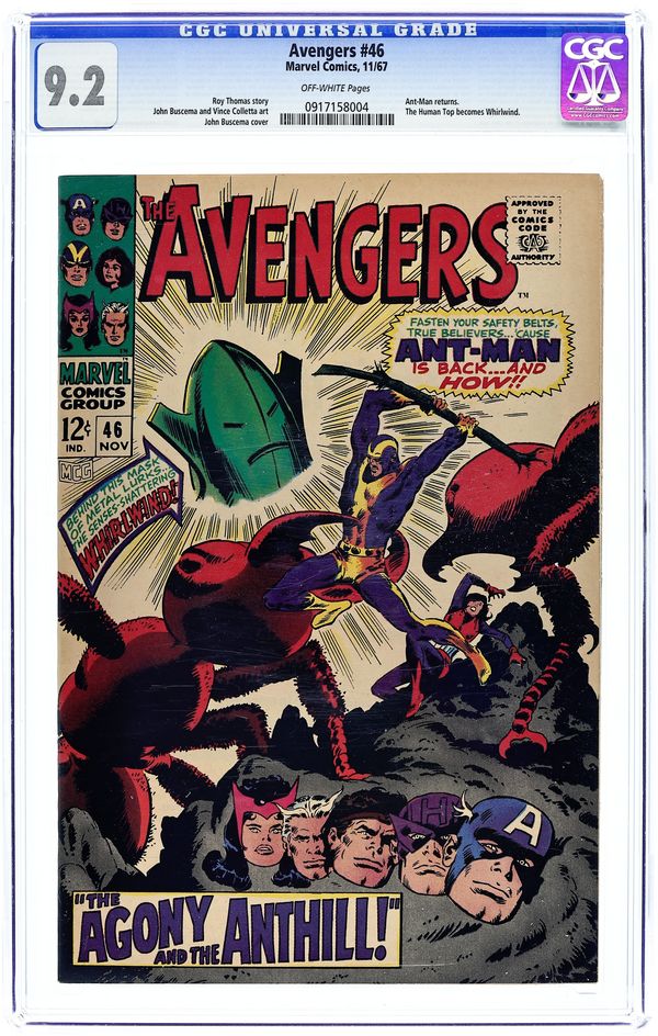 "The Agony and the Anthill!" Script by Roy Thomas. Pencils by John Buscema. Inks by Vince Colletta. Cover by John Buscema. After several busy days, the Avengers briefly convene at their Fifth Avenue mansion before going their separate ways for rest and relaxation. However Hank Pym andJanet van Dyne decide to remain at the mansion to work on a new experiment involving red ants. But the dramatic appearance of the Whirlwind (formerly known as the Human Top) interrupts their work! Goliath and the Wasp havedefeated him in the past. However the Whirlwind scouted Avengers Mansion earlier in the day (as Jan's chauffer) -- and he blasts them with a reducing ray! Then the Whirlwind throws the pair into Hank's ant farm without their cybernetic equipment. So Hank and Jan cannot talk to the ants! And the ants are very hungry! The situation looks grim...and becomes even grimmer when the Whirlwind plants a bomb inside the mansion to kill the remaining avengers. How can Earth's Mightiest Heroes turn their plight around...andavoid reaping the whirlwind? Cameo appearance by the Black Widow. Avengers Lineup: Captain America, Goliath, Hawkeye, Hercules, Quicksilver, Scarlet Witch, and the Wasp. (Note: This story was reprinted in Marvel Triple Action #38.) 36 pages. Cover price $0.12. Grade: CGC 9.2 explanation of grade Condition: Used (collectible)