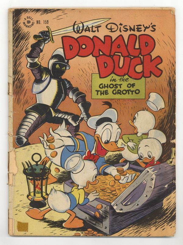 Indicia title is "Walt Disney's DONALD DUCK IN THE GHOST OF THE GROTTO, No. 159." Cover art by Carl Buettner. Donald Duck and the Ghost of the Grotto; While the ducks are running a kelp-gathering boat in the West Indies, they are told of the mystery of an armored man who appears every fifty years to kidnap a small boy; This time, the armored man kidnaps Dewey, and the ducks fight to free him from the armored man's stronghold in a grotto in a coral reef, beneath a rotten old galleon guarded by an enormous octopus. Adventure Down Under; Donald is hypnotized into believing he is a kangaroo and buys airplane tickets to Australia for himself and the nephews; In Australia the ducks try to trap Mournful Mary, the "queen of the kangaroos," and this leads to Donald's falling into the hands of savage aborigines. Scripts and art by Carl Barks. 52 pages, full color. Cover price $0.10. Grade: PR 0.5 explanation of grade Condition: Used (collectible)
