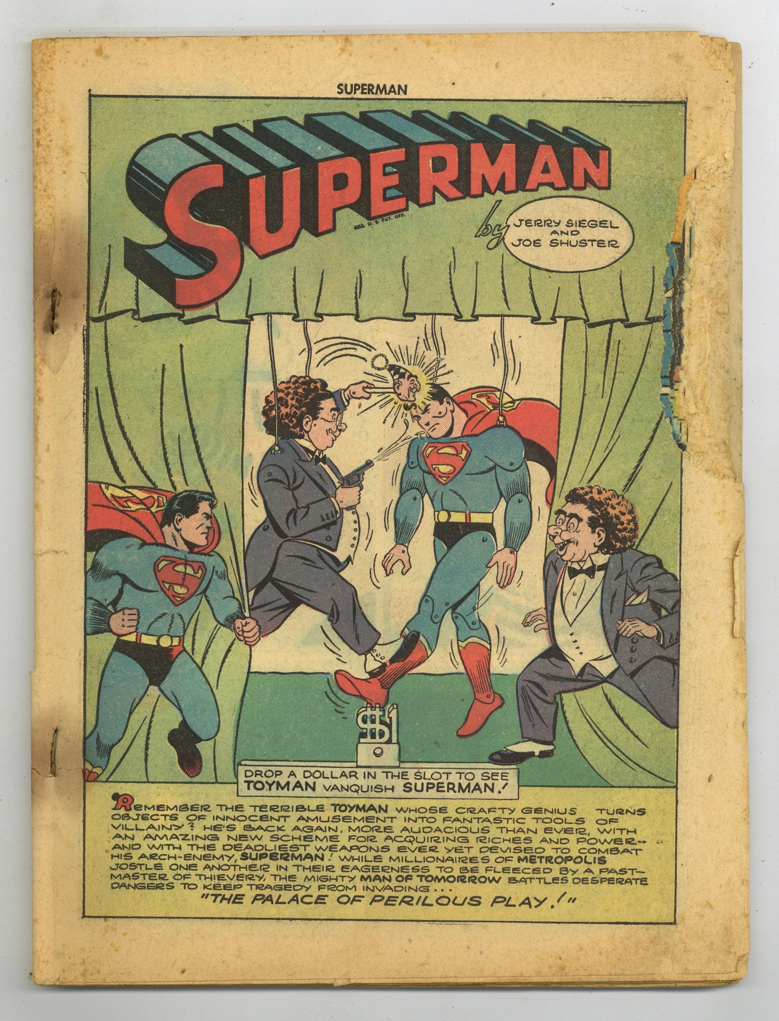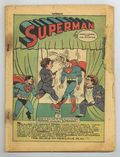 Cover pencils by Wayne Boring. The Palace of Perilous Play!, script by Don Cameron [as Jerry Siegel], pencils by Ed Dobrotka [as Joe Shuster], inks by George Roussos [as Shuster]; Superman struggles with the schemes of the terrible Toyman, who is out to design coin machines that will make him rich and devices that will give him revenge on the Man of Tomorrow. When Giants Meet!, script by Don Cameron [as Jerry Siegel], pencils by Ed Dobrotka [as Joe Shuster], inks by George Roussos [as Shuster]; While up in the big north woods in search of background material for articles on the lumbering industry, Clark and Lois listen to an entertaining tale about the time Superman and Paul Bunyan actually met. Robbers' Roost! starring Superman, script by Don Cameron [as Jerry Siegel], pencils by Ed Dobrotka [as Joe Shuster], inks by George Roussos [as Shuster]. Private Pete humor page by Henry Boltinoff. The Artistic Touch text story by Ed Selby. Dear Diary! starring Superman, script by Don Cameron [as Jerry Siegel], pencils by Ed Dobrotka [as Joe Shuster], inks by George Roussos [as Shuster]. 60 Pages, Full Color. Cover price $0.10. Grade: Coverless explanation of grade Condition: Used (collectible)