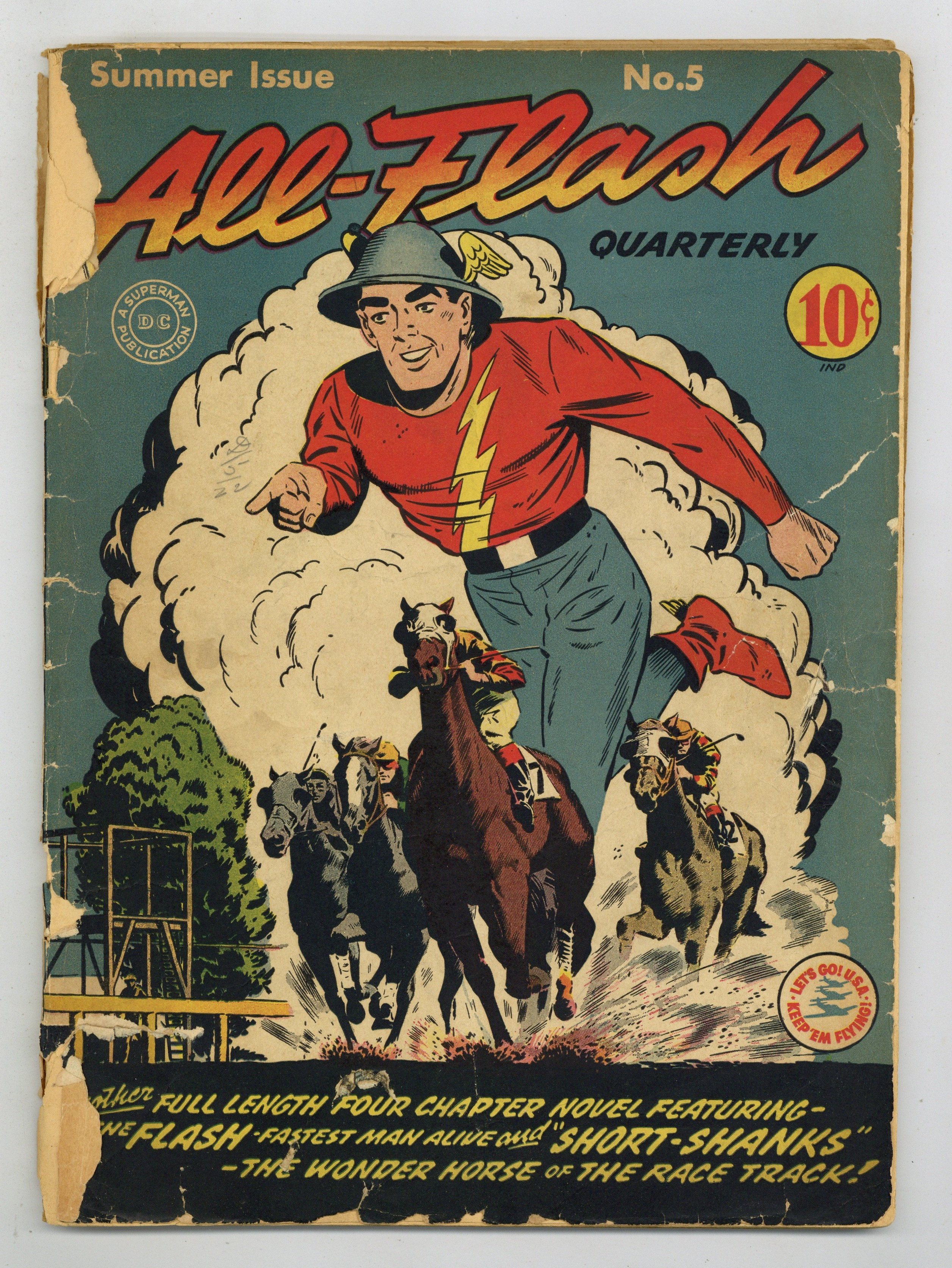 Written by Gardner F. Fox. Art and cover by Everett E. Hibbard. Flash meets Winky, Blinky and Noddy while visiting the Cumberly Horse Farm with Joan. Joan's friend Trudy owns a horse named "Short Shanks", a very fast horse that shows little promise of racing fame...until a mysterious fire and sale of the horse at public auction. Butch McLobster story by Ed Wheelan. Hop Harrigan text story by Evelyn Gaines. 68 Pages, Full Color. Cover price $0.10. Grade: FR/GD 1.5 explanation of grade Condition: Used (collectible)