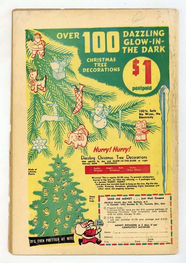 Pre-Code mystery and horror stories from Canadian publisher Superior. Beautiful ballerina Glenda goes to plastic surgeon Doctor Hill, unaware that he's obsessed with her and has plans for her face. Thieves discover the horrifying secret of hunchback Jonas Palmer, but by then it's too late. A woman investigates the bizarre secret behind a corpse that goes wandering from taxi to train to luxury cruise ship. The Broken Mirror; Midnight Prowler; Grim Wedding Day; The Wandering Corpse; Gypsys Curse. Final issue of the series. 36 pages, Full Color. Cover price $0.10. Grade: GD+ 2.5 explanation of grade Condition: Used (collectible)