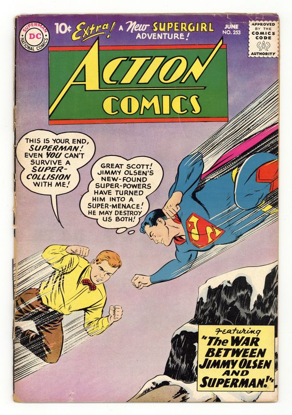 Starts Jan 19 Cover pencils by Curt Swan, inks by Stan Kaye. "The War between Jimmy Olsen and Superman!", script by Alvin Schwartz, pencils by Curt Swan, inks by Stan Kaye; A criminal from Kandor switches places with Jimmy Olsen and forces Superman to reveal the location of his Fortress of Solitude, so he can destroy the bottled city; But scientists in Kandor reverse the switch just in time. 2/3-page Tricksy, World's Greatest Stunt Man story by Henry Boltinoff. "The Secret of the Super-Orphan!", script by Otto Binder, art by Jim Mooney; Supergirl helps Timmy get adopted by assisting with his magic show using her super powers. "The Destroyer of Congo Bill!", script by Jack Miller, art by Howard Sherman. 36 Pages, Full Color. $.10 Cover price $0.10. Grade: FR 1.0 explanation of grade Condition: Used (collectible)