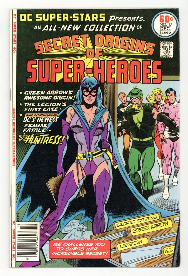 Starts Jan 19 Secret Origins of Super-Heroes -- an all-new collection! Green Arrow's awesome origin! The Legion's first case! And introducing DC's newest femme fatale -- the Huntress! Featuring: 1 page Legion of Super-Heroes; Huntress; Green Arrow story "Secret Origins of Super-Heroes" written by Paul Levitz and drawn by Jim Aparo; 10 page Green Arrow story "Origin of Green Arrow" written by Denny O'Neil and drawn by Mike Grell & Bruce Patterson; 10 page Legion of Super-Heroes story "The Secret of the Quintile Crystal!" starring the Legion of Super-Heroes [Cosmic Boy; Saturn Girl; Lightning Lad] (origin retold), Superman (cameo), R.J. Brande and Lord Lorval (villain), written by Jack C. Harris and drawn by Juan Ortiz & Bob Smith; 1 page text article "Secret Origins of Secret Origins" by Paul Levitz; 1 page Huntress illustration "Huntress Concept Art" drawn by Joe Staton (concept sketch) and Joe Orlando (cover design); 13 page Huntress story "From Each Ending...A Beginning!" starring Huntress [Helena Wayne] (origin), Batman (Earth-2), Catwoman (Earth-2), Flash [Barry Allen] (flashback), Flash [Jay Garrick] (flashback), Robin (Earth-2, flashback), Silky Cernak (villain) and Commissioner Gordon (Earth-2, cameo), written by Paul Levitz and drawn by Joe Staton & Bob Layton. Cover by Joe Staton & Bob Layton. Note : First appearance of second Huntress (Helena Wayne). This is shared by All Star Comics (1940-1978) #69 as they came out on the same day. Cover price $0.60. Grade: VG+ 4.5 explanation of grade Condition: Used (collectible)