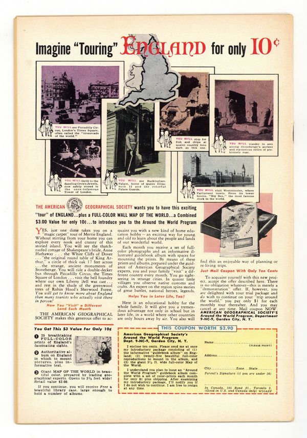 Cover pencils by Curt Swan, inks by Stan Kaye. The Helpless Hero, script by Otto Binder, art by George Papp; a boy from another planet schemes to take Superboy's place by causing all his powers to go haywire. Aquaman and His Sea-Policeman, art by Ramona Fradon; Aquaman helps out a city whose streets are all canals. Varsity Vic humor page by Henry Boltinoff. The Green Arrow Robin Hood!, art by Lee Elias; Green Arrow goes back in time and takes Robin Hood's place. 36 pages, Full Color. Cover price $0.10. Grade: VG+ 4.5 explanation of grade Condition: Used (collectible)