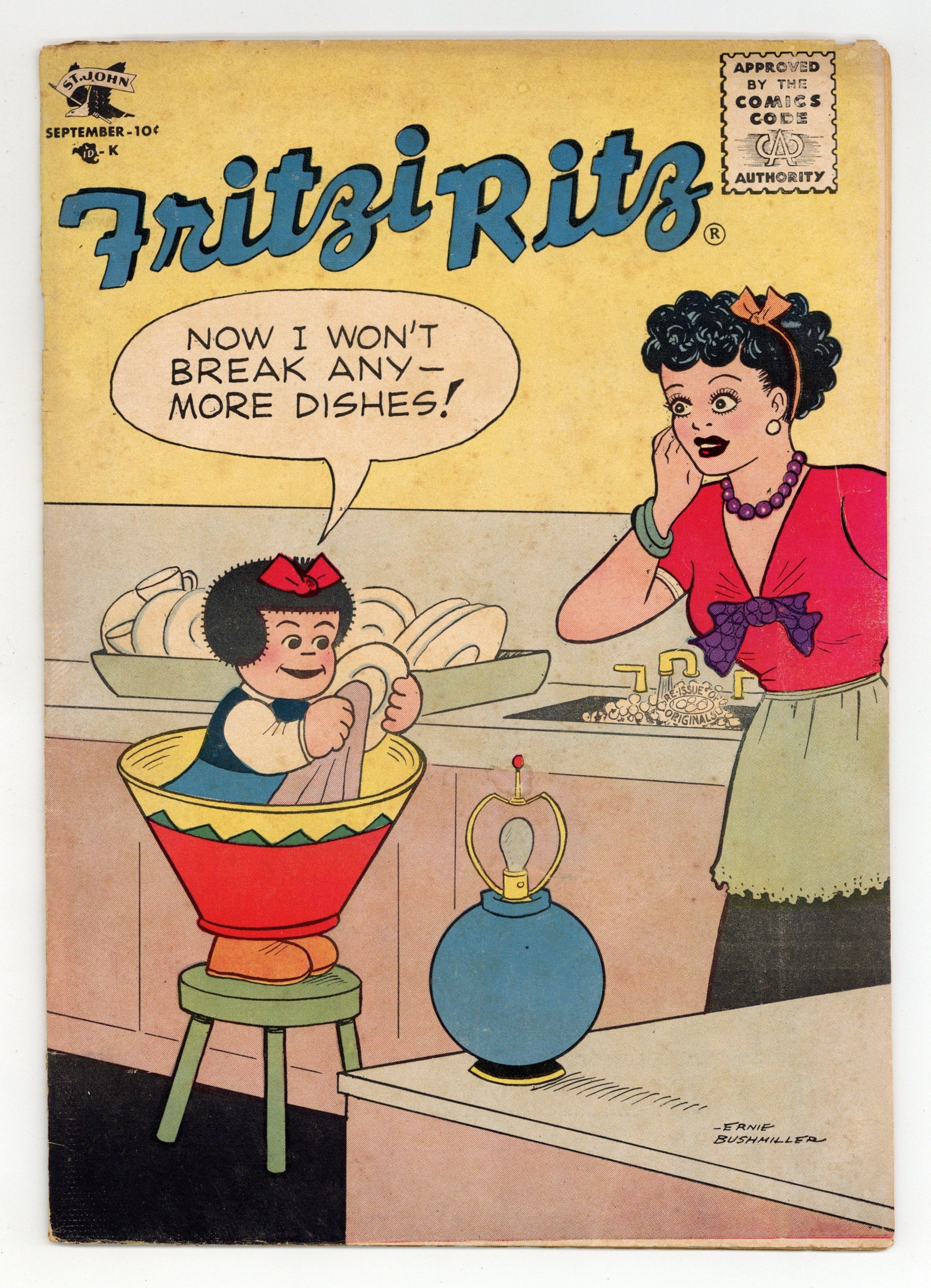 Cover by Ernie Bushmiller. Stories and art by Ernie Bushmiller, Charles Schulz, Ernest G. Osborne, and Leonard Sansone. The comic-strip adventures of aspiring model Fritzi Ritz, her boyfriend Phil Fumble, and her precocious niece Nancy. Phil takes in the bathing beauties at the beach, in a strip that showcases Bushmiller's "good girl" art. Fritzi wants to go to a "modern" restaurant, in a strip that likewise showcases Bushmiller's design talent. Fritzi's new perfume leaves something to be desired. Plus early Peanuts strips by Charles Schulz, and the Dennis the Menace-like Willie. The Family Scrapbook; Fritzi Ritz; Willie; Peanuts; Nancy. 32 pages, Full Color. Cover price $0.10. Grade: GD/VG 3.0 explanation of grade Condition: Used (collectible)