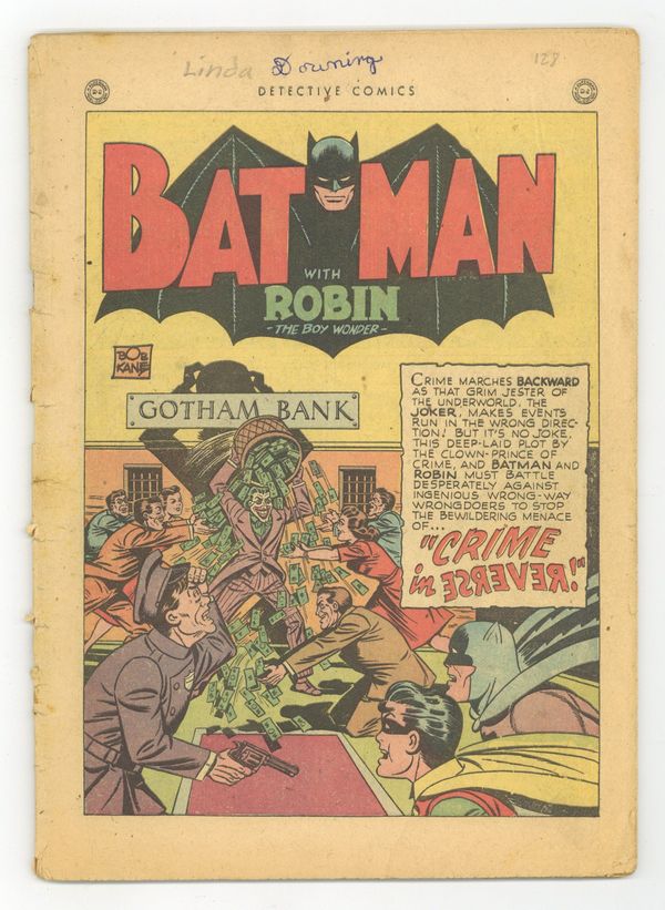 Cover by Dick Sprang. Stories by Jack Farr and unknown. Art by Jack Farr, Paul Cooper, Ray Burnley, John Daly, Lee Harris and unknown. The Joker pulls a fast one on Batman and Robin, who have just jailed him: he vows to commit all of his crimes in reverse in "Crime in esreveR!" with art by Paul Cooper and Ray Burnley. Plus: Three-Ring Binks in an untitled story by Jack Farr; Slam Bradley in "Shorty, the Medicine Man!" with art by John Daly; Air Wave in "The Bandits and the Bells!" with art by Lee Harris; and The Boy Commandos in "Rip Carter -- Killer!" Also: 2-page text story "Fireman for a Day" by Cliff Rhodes. 52 pages, full color. Cover price $0.10. Grade: Coverless explanation of grade Condition: Used (collectible)