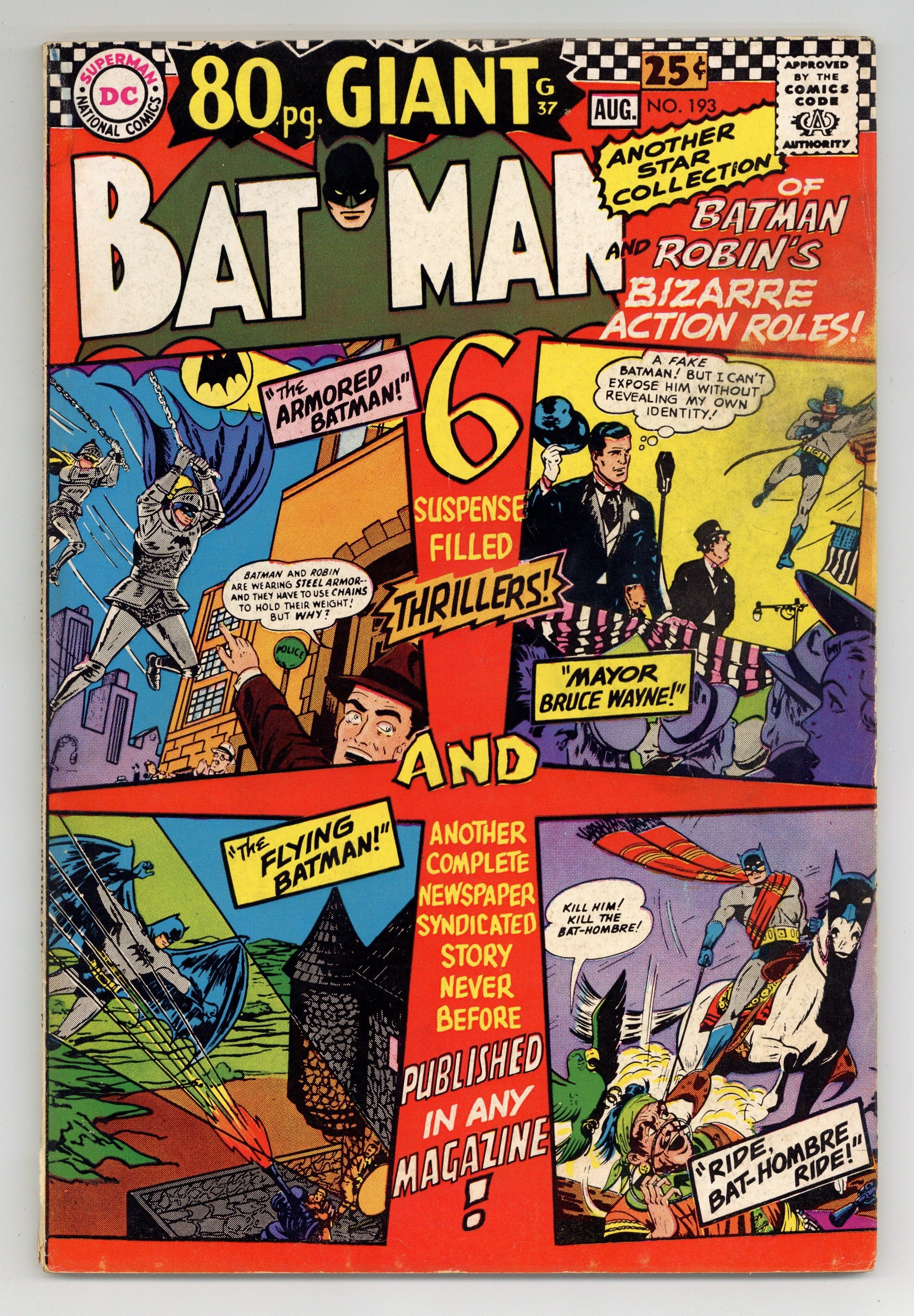 Cover pencils by Dick Sprang, Win Mortimer, Sheldon Moldoff, inks by Charles Paris, Win Mortimer, and Sheldon Moldoff. "Ride, Bat-Hombre, Ride!", script by David Vern, pencils by Dick Sprang, inks by Charles Paris; The sickly Presidente of a Latin American nation implores the Caped Crusaders to come to his nation and train a Batman to keep law and order in his country. "The Armored Batman," script by Edmond Hamilton, pencils by Sheldon Moldoff, inks by Stan Kaye; All of Gotham City is puzzled by Batman and Robin's odd behavior and strange costuming when they hear of a man named Blair Graeme threatening the Caped Crusaders. "His Majesty, King Batman," script by Bill Finger, pencils by Sheldon Moldoff, inks by Charles Paris; A visiting royal dignitary visiting Gotham City gets an unexpected role he never expected: to play the role of Batman while the real Caped Crusader looks for a wanted felon. Make Your Summer Count! public service announcement, art by Sheldon Moldoff. "Batman and the Vikings!", pencils by Bob Kane, inks by Charles Paris; When Bruce and Dick visit the Gotham City museum, they note an image of a Viking that looks like Bruce Wayne...and who is labeled a coward, so they visit Carter Nichols to go back in time to discover the truth. "Mayor Bruce Wayne!", script by David Vern, pencils by Dick Sprang, inks by Charles Paris; Racketeer Deuce Chalmers has figured out that Bruce Wayne is Batman...the trouble is, how does he prove it?; And Bruce has troubles as well with his secret identity since he has been appointed temporary Mayor. "The Flying Batman", script by David Vern, pencils by Sheldon Moldoff, inks by Stan Kaye; Batman and Robin are rendered unconscious by a sting from a strange winged man, only to awake in a weird city inhabited by winged men, who want to operate on Batman to give him wings in order to track down desperate felons.. A complete Sunday newspaper syndicated story reprinted, script by Bill Finger, pencils by Jack Burnley, inks by Charles Paris. 84 Pages, Full Color. Cover price $0.25. Grade: VG 4.0 explanation of grade Condition: Used (collectible)