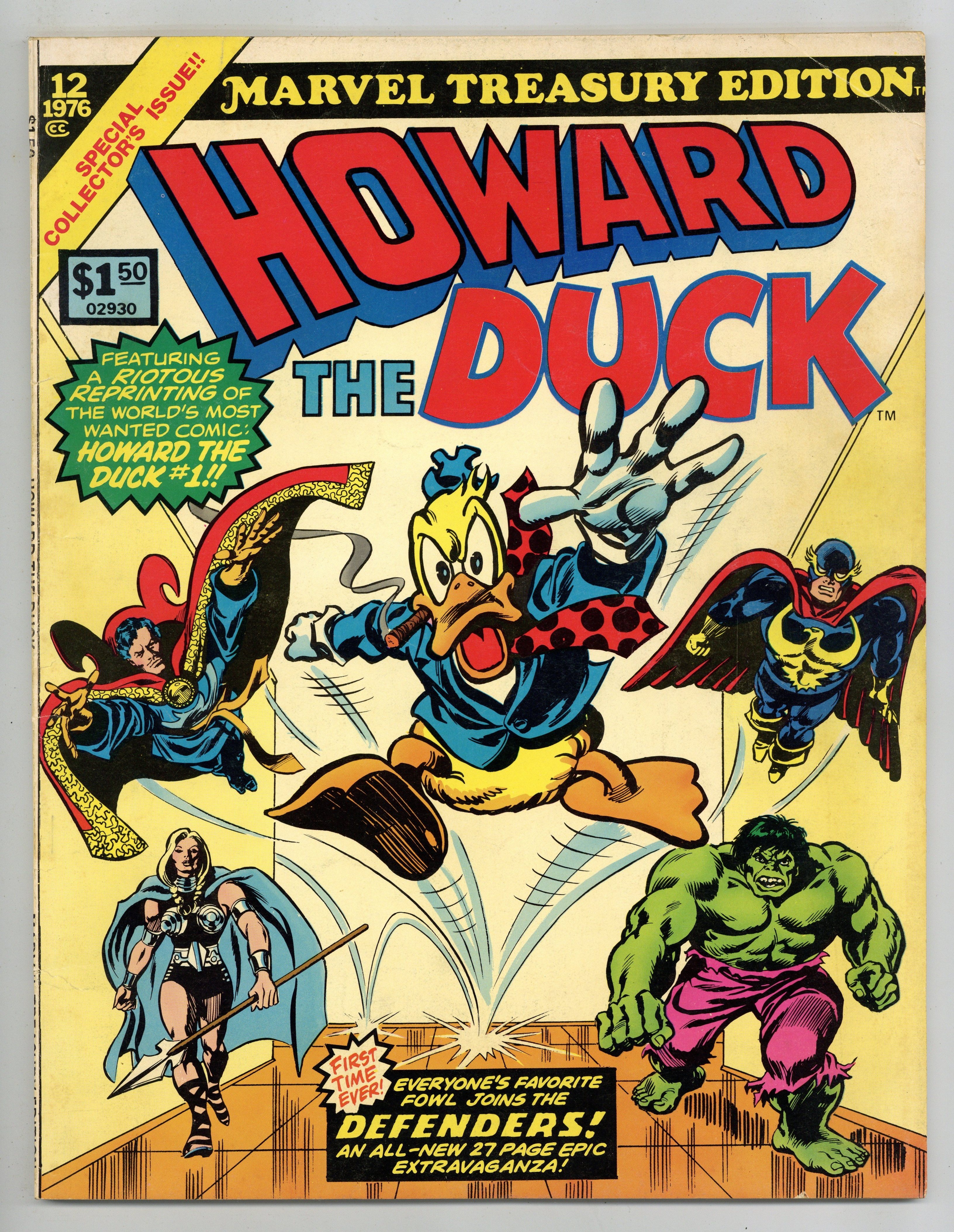 Starts Jan 26 Marvel Treasury Edition (1974) #12 features Howard the Duck. Includes the all-new adventure "The Duck and the Defenders" by Steve Gerber, Sal Buscema, and Klaus Janson. Also, reprints Fear #19 and Giant-Size Man-Thing #4-5 featuring "The Way it All Began" by Steve Gerber, Val Mayerik, and Sal Trapani, "Frog Death" by Steve Gerber and Frank Brunner, and "Hellcow" by Steve Gereber, Frank Brunner, and Tom Palmer. Guest-starring the Defenders (Valkyrie, Nighthawk, Dr. Strange, and the Hulk) and the Man-Thing. Plus, a special reprinting of Howard the Duck #1 by Steve Gerber, Frank Brunner, and Steve Leialoha. 82 pages. Cover price $1.50. Grade: VG 4.0 explanation of grade Condition: Used (collectible)