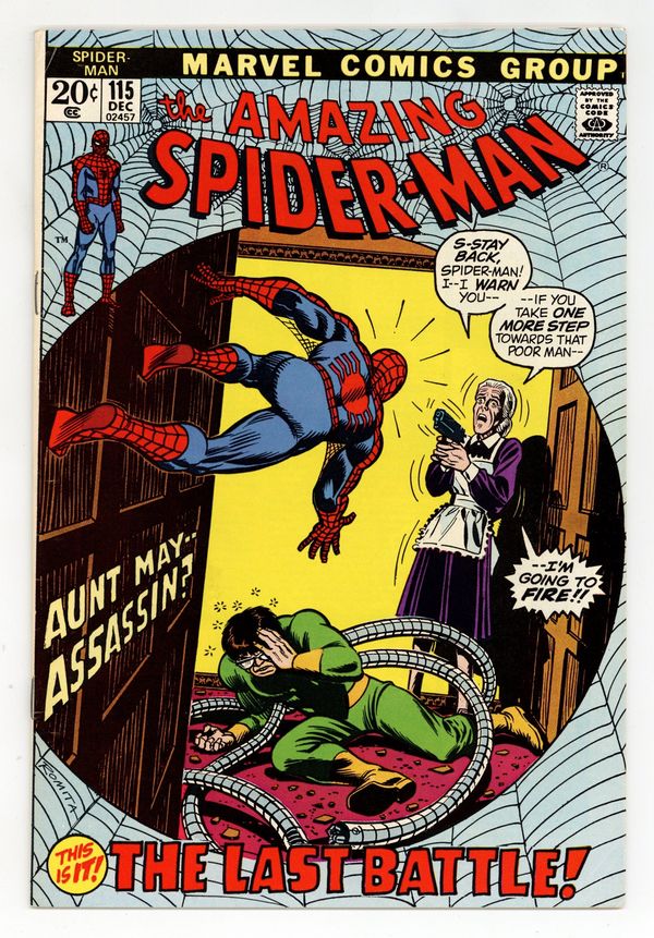 Starts Jan 26 "The Last Battle!" Part 3 of 3. Script by Gerry Conway. Art by John Romita and Tony Mortellaro (backgrounds). Cover by John Romita. It's a wild shootout in Westchester as the gang war between Hammerhead and Dr. Octopus reaches its conclusion! And amidst the raging gun battle, Spider-Man finds Aunt May! But shockingly, Aunt May has thrown in with Doc Ock! So while dodging Doctor Octopus' arms and Hammerhead's bullets, the web-slinger has to make sure -- he doesn't get clipped by his dear aunt! In the meantime, the Daily Bugle learns about the firefight in Westchester; andJoe Robertson, Ned Leeds, and Gwen Stacy drive to the scene! Can your friendly neighborhood Spider-Man defeat two super-villains -- and save his Aunt May -- in one fell swoop? What a finish! Cameo appearances by J. Jonah Jameson and Betty Brant. (Notes: John Romita is credited as aco-plotter. Hammerhead and Dr. Octopus return in Amazing Spider-Man 130. This issue is reprinted in Marvel Tales #94.) 36 pages. Cover price $0.20. Grade: FN 6.0 explanation of grade Condition: Used (collectible)