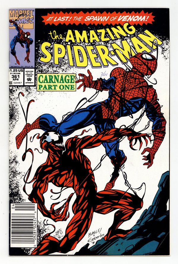 Starts Jan 26 First Printing. Newsstand Edition. First (full) appearance of Carnage in "Savage Genesis!" Part 1 of 3. Script by David Michelinie. Pencils by Mark Bagley. Inks by Randy Emberlin. Cover by Mark Bagley and Randy Emberlin. Blood runs in the streets as a serial killer roams New York City! And as the web-slinger investigates the murders, he notices a very disturbing similarity to another killer's modus operandi! In a burned-out building in Brooklyn, the spectacular one comes face-to-face with his new homicidal foe...Carnage! Can the wall-crawler end Cletus Kasady's rampage in their very first encounter? Cameo appearances by Aunt May and Mary Jane Watson. Flashback cameo by Venom. (Note: This three-part story was reprinted in 2011 in the trade paperback: Spider-Man -- The Vengeance of Venom.) 36 pages, full color. $1.25 cover price. NOTE: Most of these were distributed with slight printer tears in the bottom edge of the cover. Cover price $1.25. Grade: FN+ 6.5 explanation of grade Condition: Used (collectible)