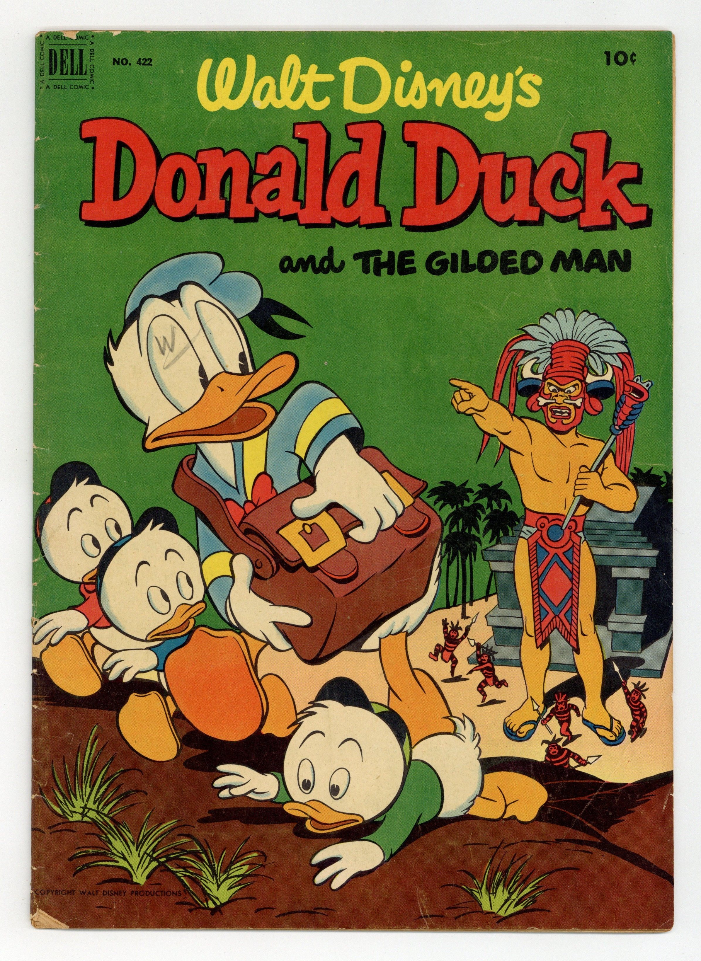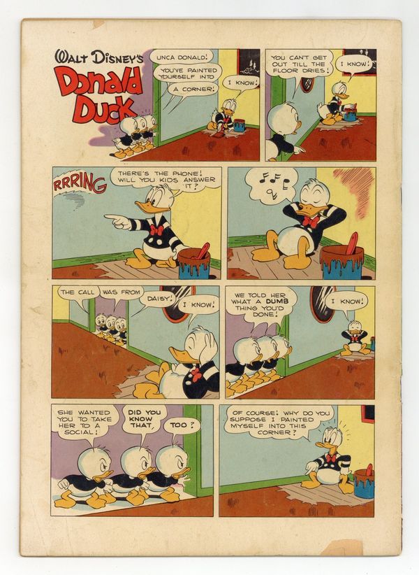 Starts Jan 26 Cover art by Carl Barks. Stable Prices; Scrooge complains about the price at Donald's riding stable. Donald Duck and "The Gilded Man"; The ducks go to British Guiana in search of the world's rarest stamp, a one-cent magenta of 1856, and find it on a letter in the possession of El Dorado, a giant golden Indian; After they retrieve the letter, the ducks learn that it is addressed to a deceased Duckburg resident who named Gladstone her only heir. Armored Cat Rescue; Donald puts on sturdy clothing to bring Daisy's cat down from a telephone pole. All scripts and art by Carl Barks. 36 pages, full color. Cover price $0.10. Grade: GD+ 2.5 explanation of grade Condition: Used (collectible)