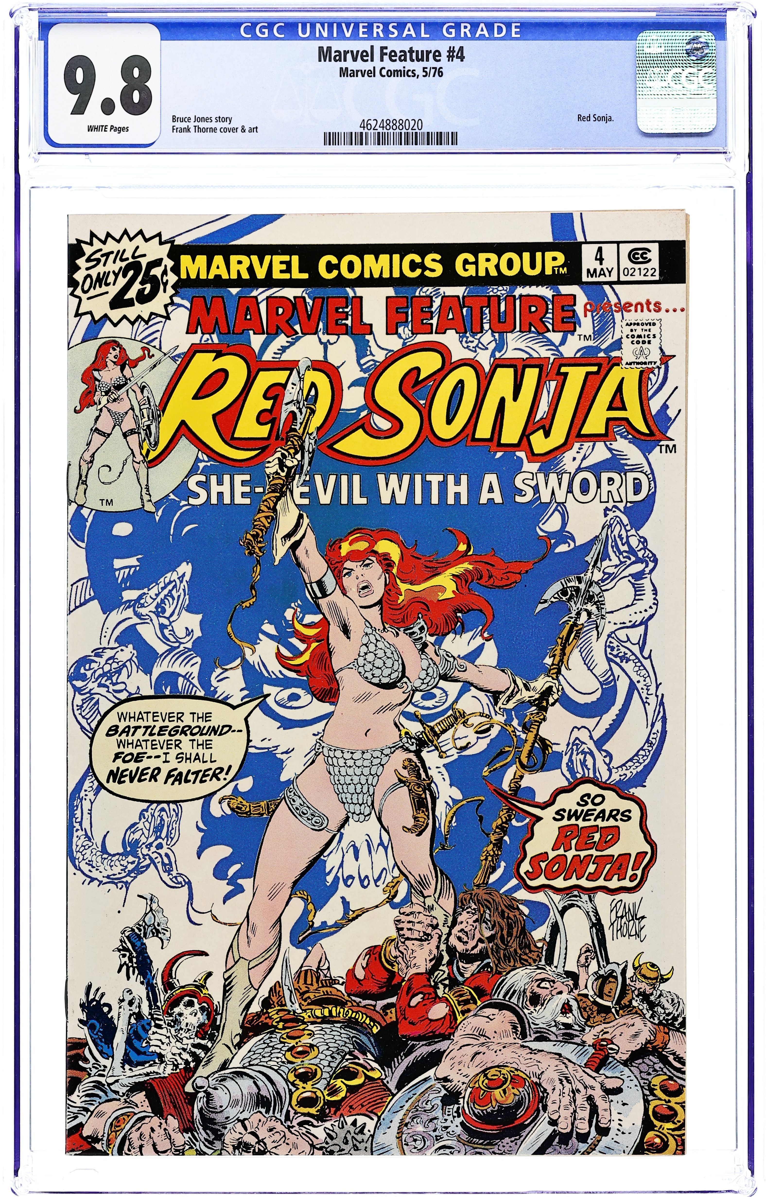 Cover art by Frank Thorne. "Eyes of the Gorgon," script by Bruce Jones, pencils by Frank Thorne; Red Sonja comes to a town that is being attacked by a Gorgon, who is turning the townspeople to stone. 36 pgs., full color. $0.25. Cover price $0.25. Grade: CGC 9.8 explanation of grade Condition: Used (collectible)