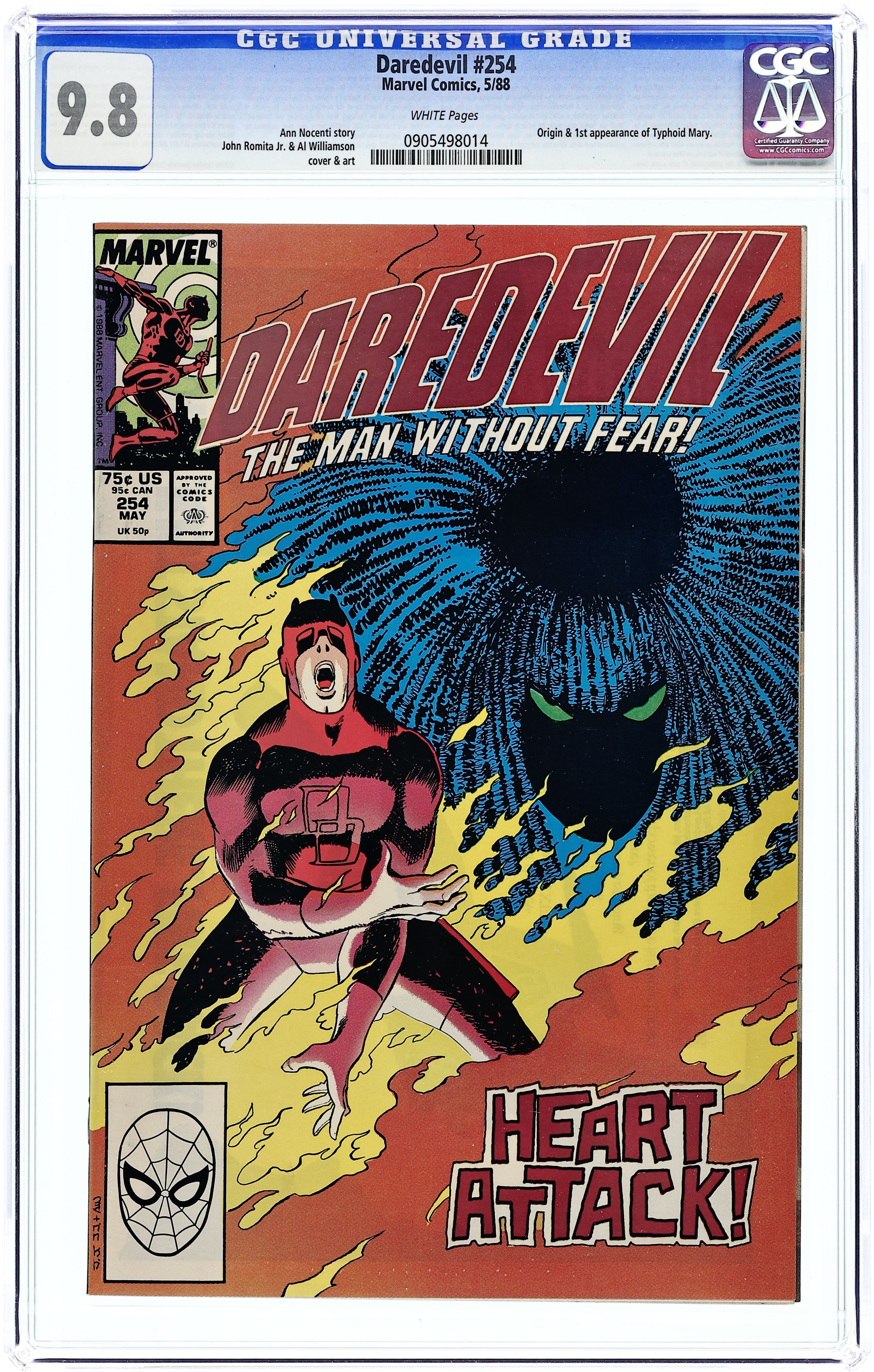 Direct Edition. Cover pencils by John Romita, Jr., inks by Al Williamson. First appearance of Typhoid Mary in Typhoid!, script by Ann Nocenti, pencils by John Romita Jr., inks by Al Williamson; Typhoid Mary blows into town and starts robbing the Kingpin's operations; Thinking he has finally found a way to get to Daredevil, Kingpin offers Typhoid a million dollars if she can make DD fall in love with her and then crush him; Matt meets Mary. 32 pgs. Cover price $0.75. Cover price $0.75. Grade: CGC 9.8 explanation of grade Condition: Used (collectible)