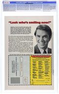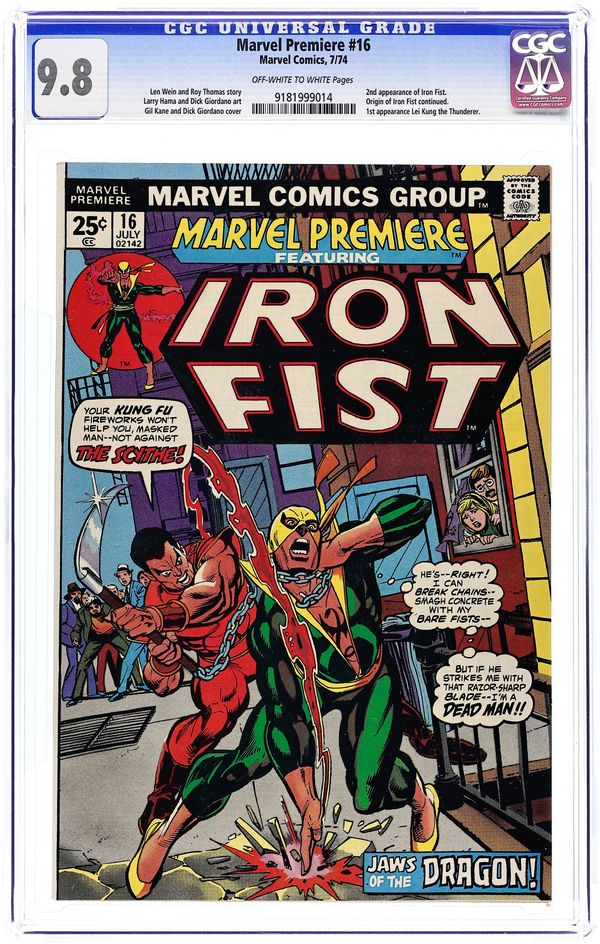 Cover pencils by Gil Kane, inks by Dick Giordano. Heart of the Dragon!, script by Roy Thomas (co-plotter) and Len Wein, pencils by Larry Hama, inks by Dick Giordano and Klaus Janson; Danny completes his training in K'un-Lun and acquires the power of the Iron Fist but rather than partake of immortality, he decides to return to his own world and seek vengeance against his parents' killer, Harold Meachum; On arriving in New York, Danny faces assassins who are trying to collect a ten thousand dollar bounty against him. The letters page contains a text feature by Tony Isabella and Marvel Value Stamp series A # 71 (the Vision by John Buscema). 36 pgs. $0.25. NOTE: 2nd appearance and origin of Iron Fist. Cover price $0.25. Grade: CGC 9.8 explanation of grade Condition: Used (collectible)