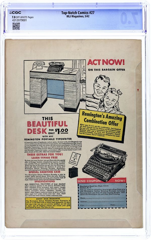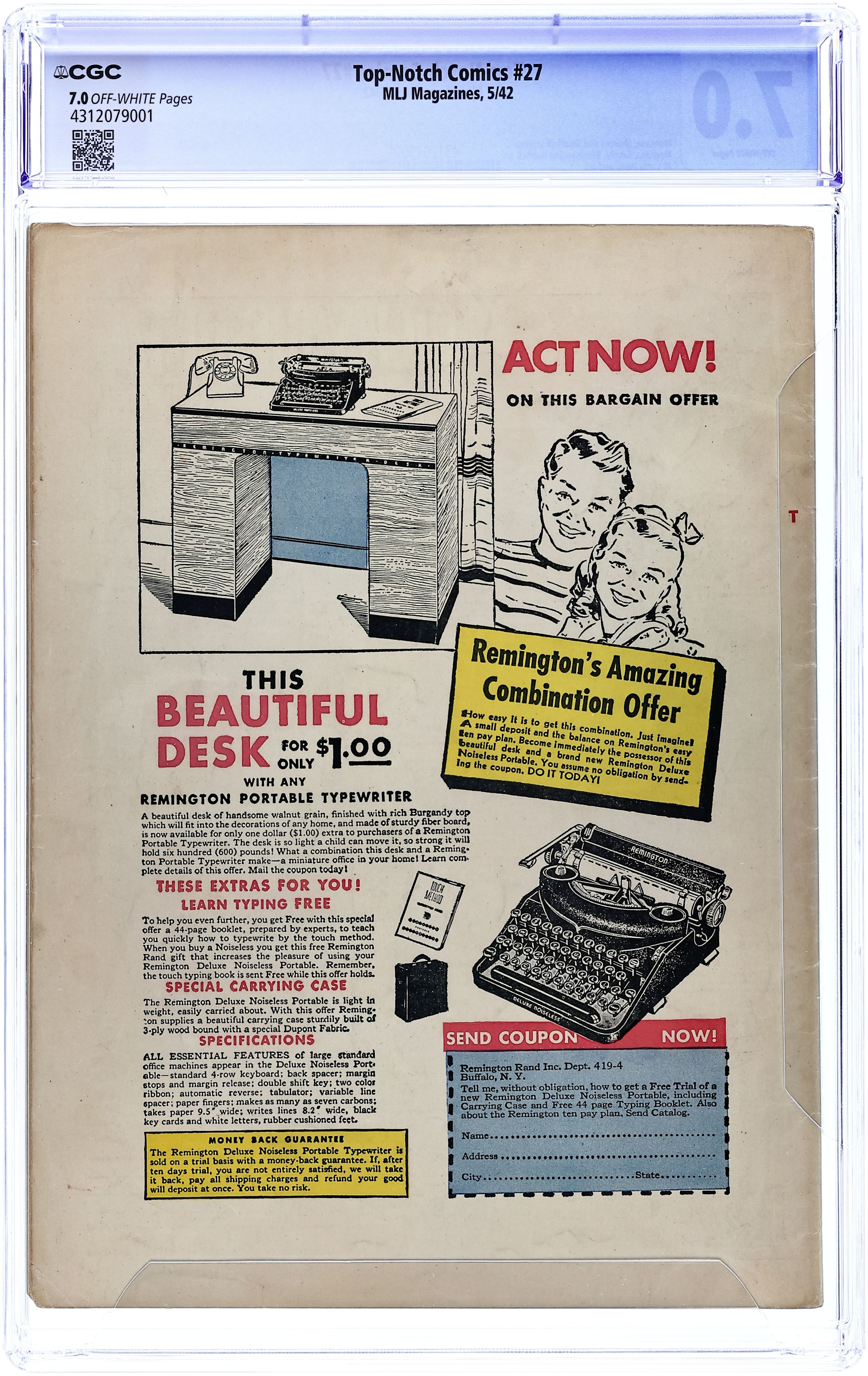 Next issue the series will change to Top Notch Laugh. Cover by Al Camy. Edited by Harry Shorten. Stories by Harry Shorten, Al Camy, Bill Woolfolk, Paul Reinman, Carl Hubbell, Warren King, Bob Montana, Joe Blair, Ed Smalle, and Jim Phillips. Heroic tales of action and adventure—these are Top Notch Comics! 68 pages, full color. $0.10. Cover price $0.10. Grade: CGC 7.0 explanation of grade Condition: Used (collectible)