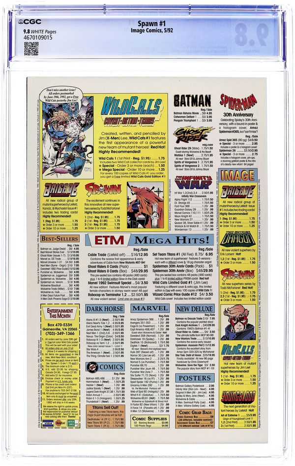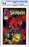 Direct edition. "Questions!" Part 1 of 4. Created, story, and art by Todd McFarlane. When government assassin Al Simmons is murdered, a deal with the devil brings him back to the realm of the living. But now he walks the shadows as the disfigured soldier of hell known as Spawn. Armed with unimaginable, but finite, magical abilities, Spawn is destined to play an important role in the upcoming Armageddon. But, what happens when this rebellious anti-hero decides he won't fight for either side? Superstar artist and Image co-founder, Todd McFarlane, creates a character who has gone on to inspire a major motion picture, an HBO animated series, numerous spin-off comic series, and one of the most successful toylines of all time. Spawn centerfold by Todd McFarlane & Ken Steacy. Pin-up of Spawn by George Perez. Pin-up of PITT by Dale Keown. Cover by McFarlane & Steacy. 1st app of Sam and Twitch Cover price $1.95. Grade: CGC 9.8 explanation of grade Condition: Used (collectible)