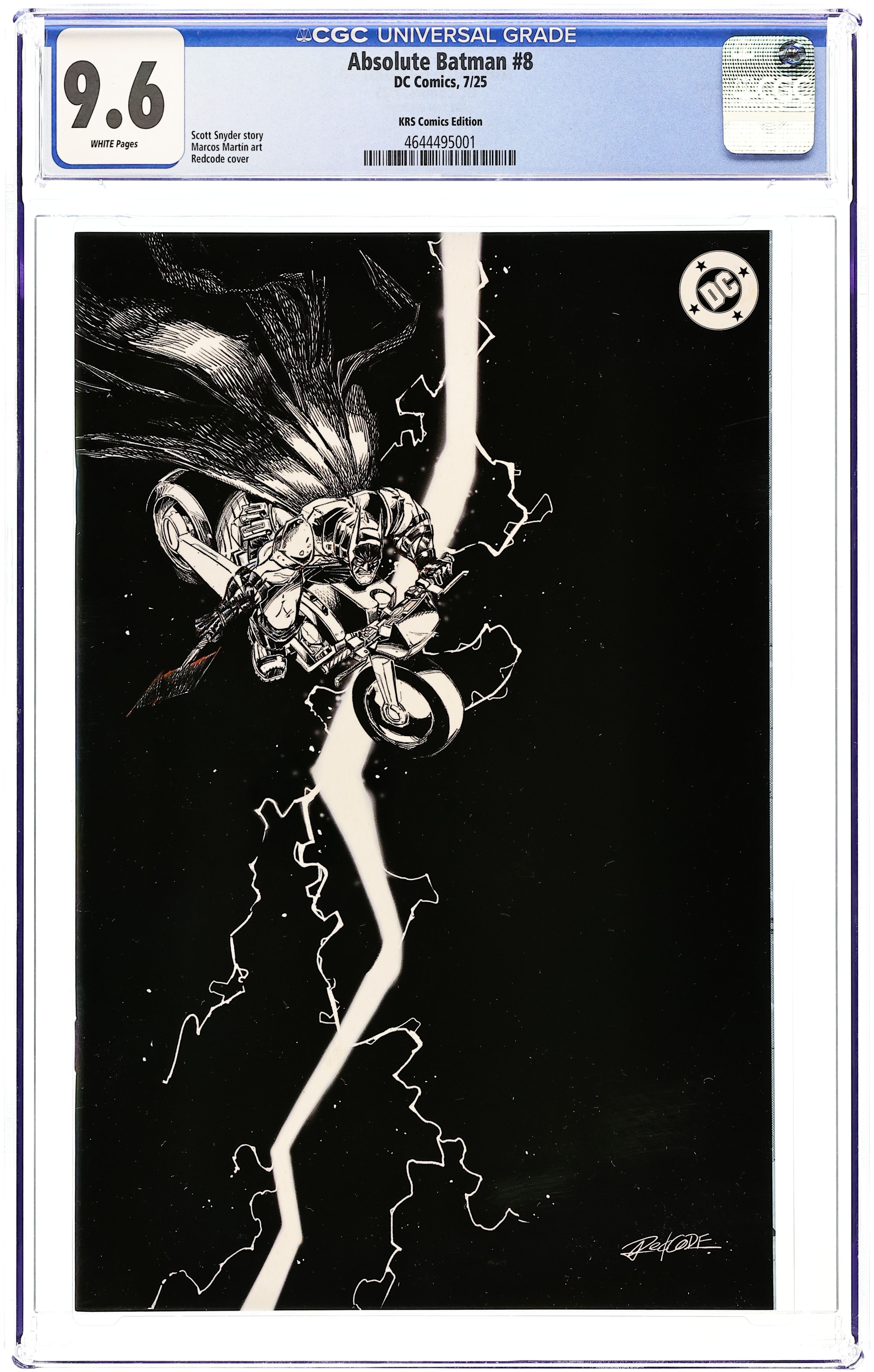 Starts Jan 26 KRS Comics Convention Exclusive B&W Virgin Cover by Redcode. Written by Scott Snyder. Art by Marcos Martin. GOTHAM IN THE GRASP OF MR. FREEZE! Batman is in the fight for his life against this icy new threat. But in the end, what terrifying truth will be unearthed about Ark M and...Joker? 32 pages, full color. Rated T+ Grade: CGC 9.6 explanation of grade Condition: Used (collectible) unless item is a new release