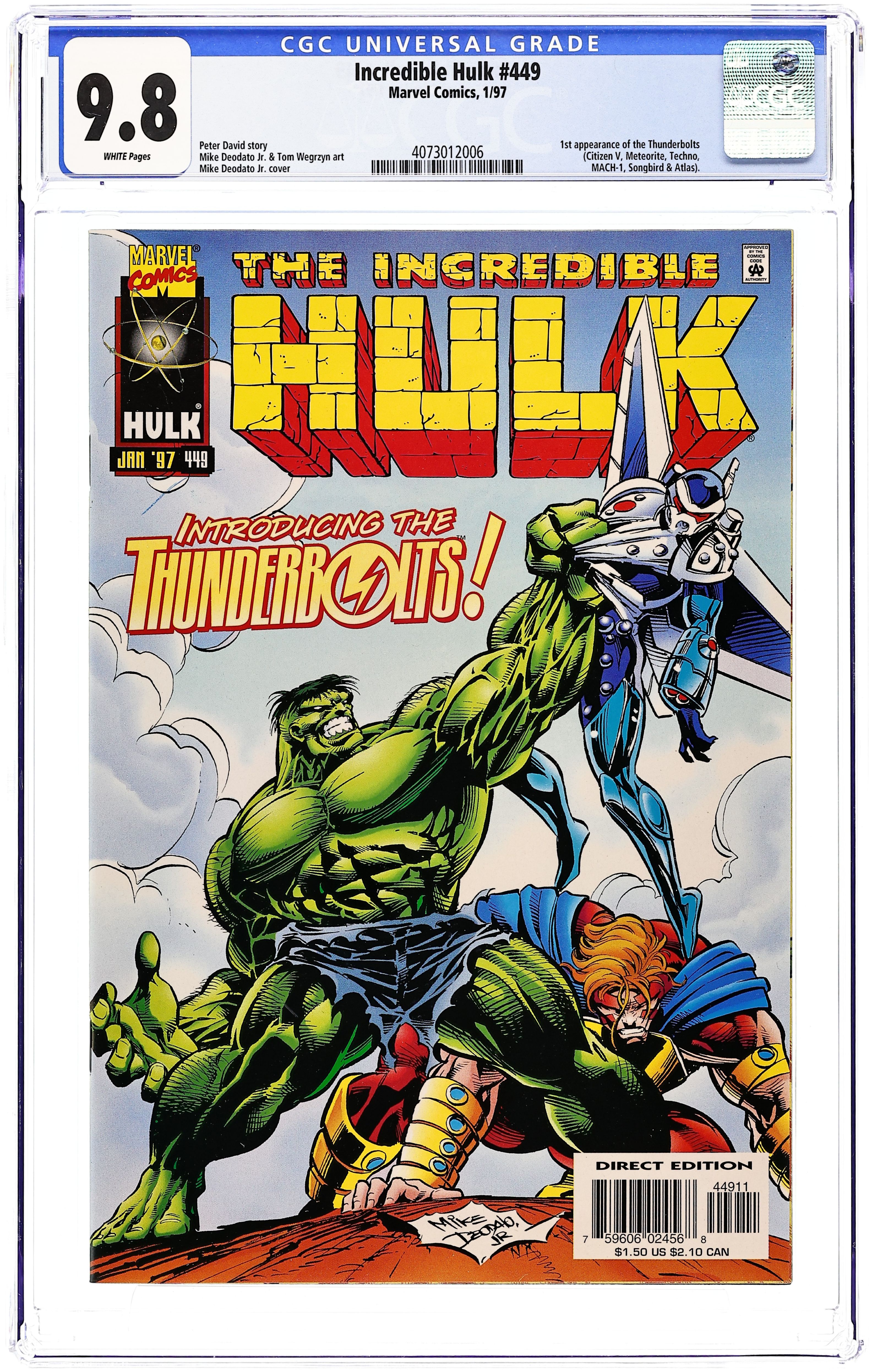 Starts Jan 26 Direct Edition. Cover by Mike Deodato Jr. It's the first appearance of the Thunderbolts in the aptly-titled "Introducing the Thunderbolts," script by Peter David, pencils by Mike Deodato Jr., inks by Tom Wegrzyn; Hulk and Janis are attacked by the Thunderbolts; Hulk is hurt during the fight, and breaks the wall of a dam to switch their attention onto saving citizen lives; At the end of the issue we see the Hulk falling on his knees, grabbing his chest. Characters: Hulk (Bruce Banner); Thunderbolts (Citizen V; Mach-1; Songbird; Techno; Atlas; Meteorite) ; Janis Jones. 36 pgs., full color. $1.50. Cover price $1.50. Grade: CGC 9.8 explanation of grade Condition: Used (collectible)