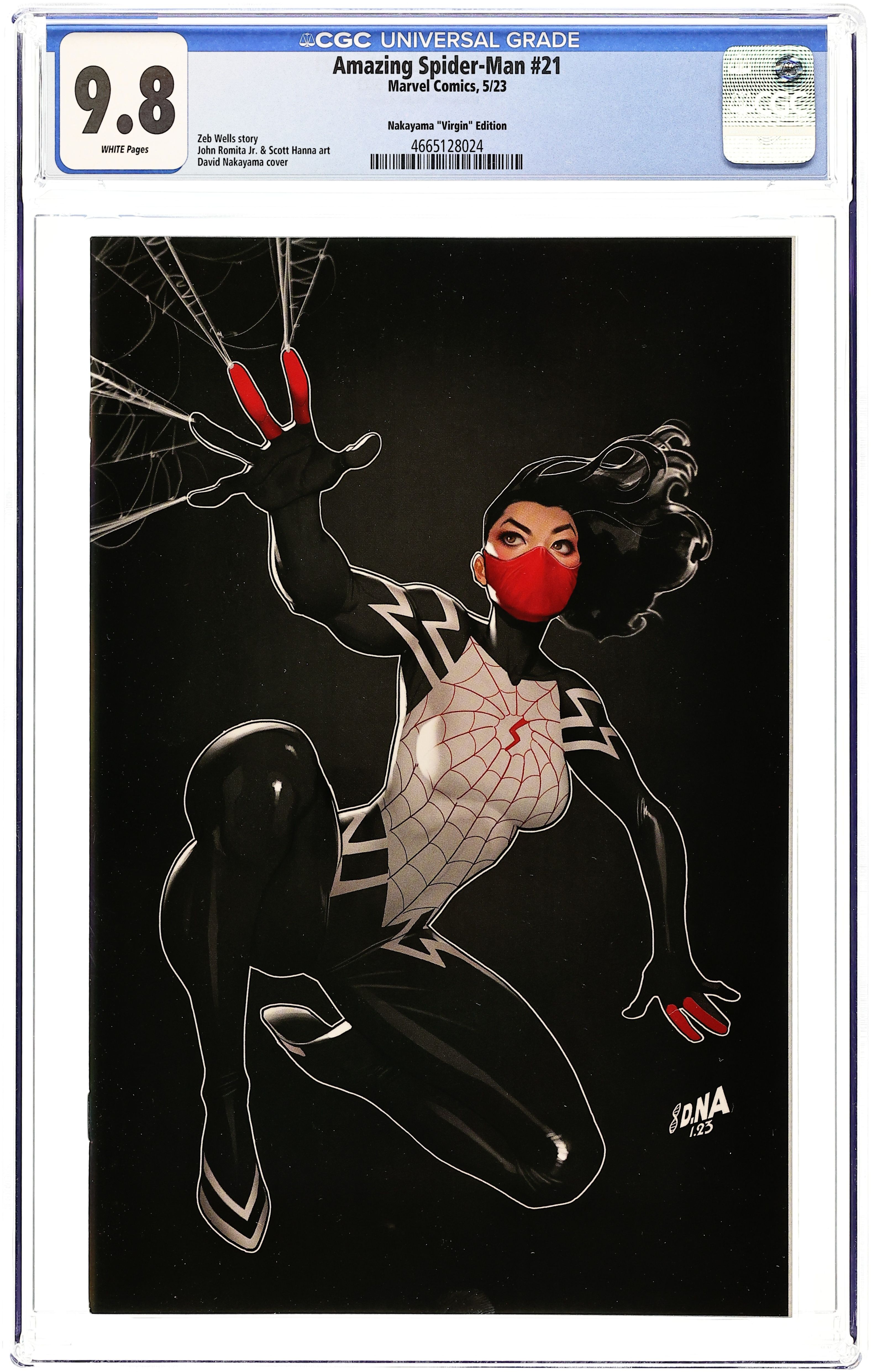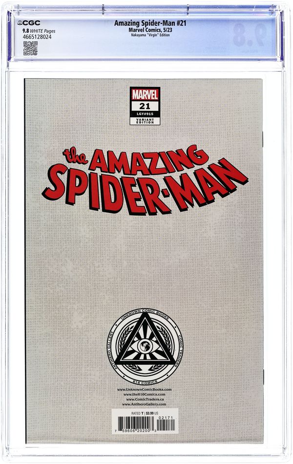 Comics Illuminati (Unknown Comics, Street Level Hero, and Comic Traders) exclusive Virgin Cover by David Nakayama. Written by Zeb Wells. Art by John Romita Jr. WHAT HAPPENED TO PETER AND MARY JANE?! It's time. This arc will answer your questions including…WHAT DID PETER DO?! Who caused all of this? 28 pages, full color. Rated T Grade: CGC 9.8 explanation of grade Condition: Used (collectible)