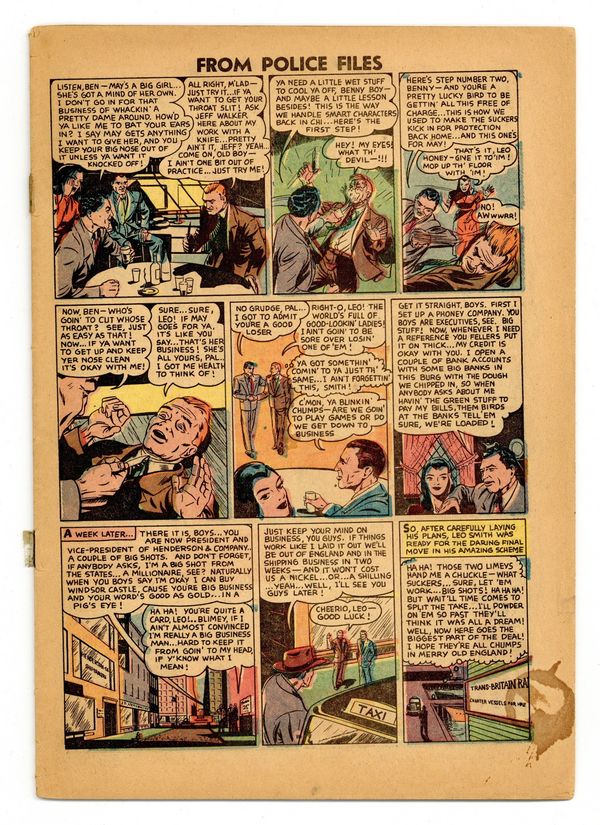 Ends Mar 16 8:04 PM CST Bid History 1 bid Current Bid $1 Your Secret Max Bid If you'd like to bid, please log in or register. In order of appearance: "The Saga of the S.S. Ferret" retitled and reprinted as "The Saga of the Slaughter at Sea" in Startling Terror Tales (1953-54 2nd Series) #6; "Basil 'The Owl' Banghart"; and "Monk Eastman, The East Side Terror!" retitled and reprinted as "The Hoodlum of Horror" in Shock Detective Cases (1952) #21. "The Double Fool" text story. 36 pages. Full color. Cover price $0.10. Grade: Coverless explanation of grade Condition: Used (collectible)