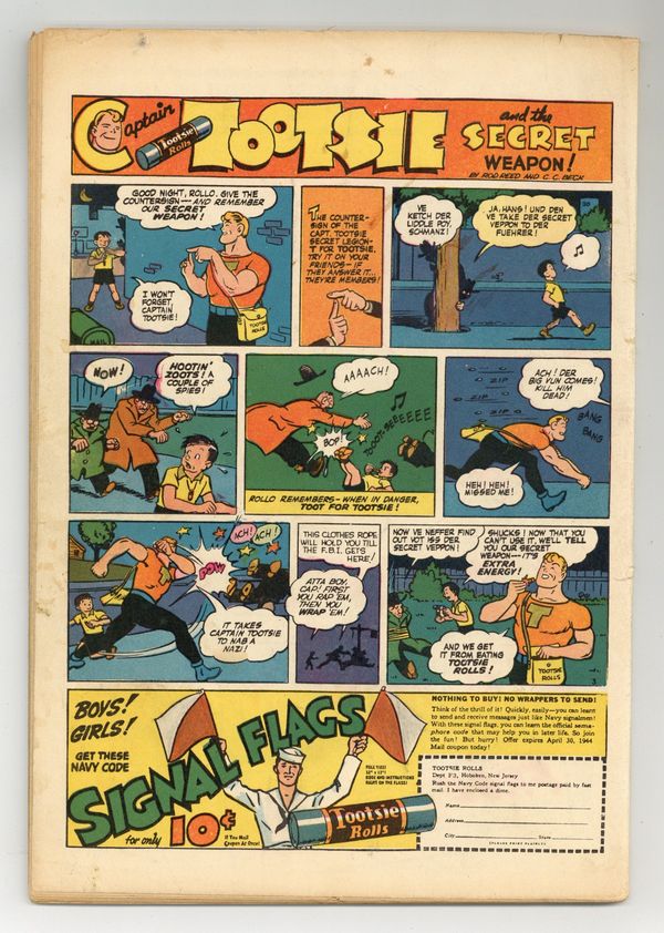 Cover by C.C. Beck. Stories by Otto Binder, Rod Reed and unknown. Art by C.C. Beck and unknown. Captain Marvel discovers Mr. Mind's South Pacific headquarters but the villain has left multiple booby traps behind, one of which changes him back to Billy Batson and delivers him to the crocodile men of Planetoid Punkus in "The Monster Society of Evil Chapter 10: The Booby Traps of Mr. Mind!" by Otto Binder and C.C. Beck. Captain Marvel also stars in: "Captain Marvel in Buffalo!" with story by Rod Reed (Buffalo, N.Y. city story); "Captain Marvel Enforces the Law of Gravity!" with story by Otto Binder; and "Captain Marvel Fights His Own Conscience!" with story by Otto Binder. Plus: Captain Kid in an untitled 2-pager. And: 2-page text story "Canteen Spy" by Rod Reed. 60 Pages, Full Color. Cover price $0.10. Grade: GD/VG 3.0 explanation of grade Condition: Used (collectible)