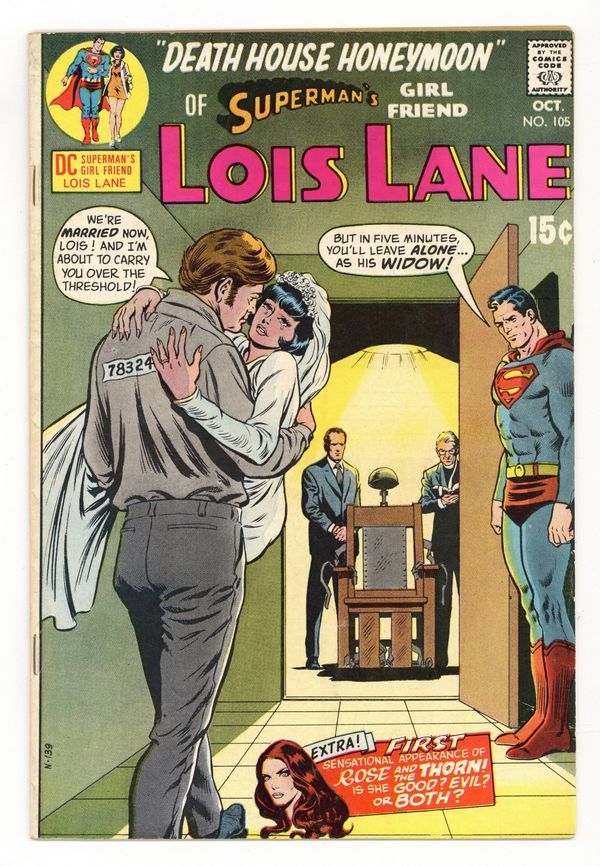 Starts Jan 26 1st appearance and origin of Rose and Thorn. Cover pencils by Curt Swan, inks by Murphy Anderson. Death House Honeymoon!, script by Robert Kanigher, pencils by Art Saaf and Ross Andru, inks by Mike Esposito; Johnny Adonis, a murderer on death row, asks Lois to marry him as his last request. Night of the Thorn, script by Robert Kanigher, pencils by Ross Andru, inks by Mike Esposito; Rose Forrest becomes the Thorn to avenge her father's murder by The 100. 36 Pages, Full Color. Cover price $0.15. Grade: VG+ 4.5 explanation of grade Condition: Used (collectible)