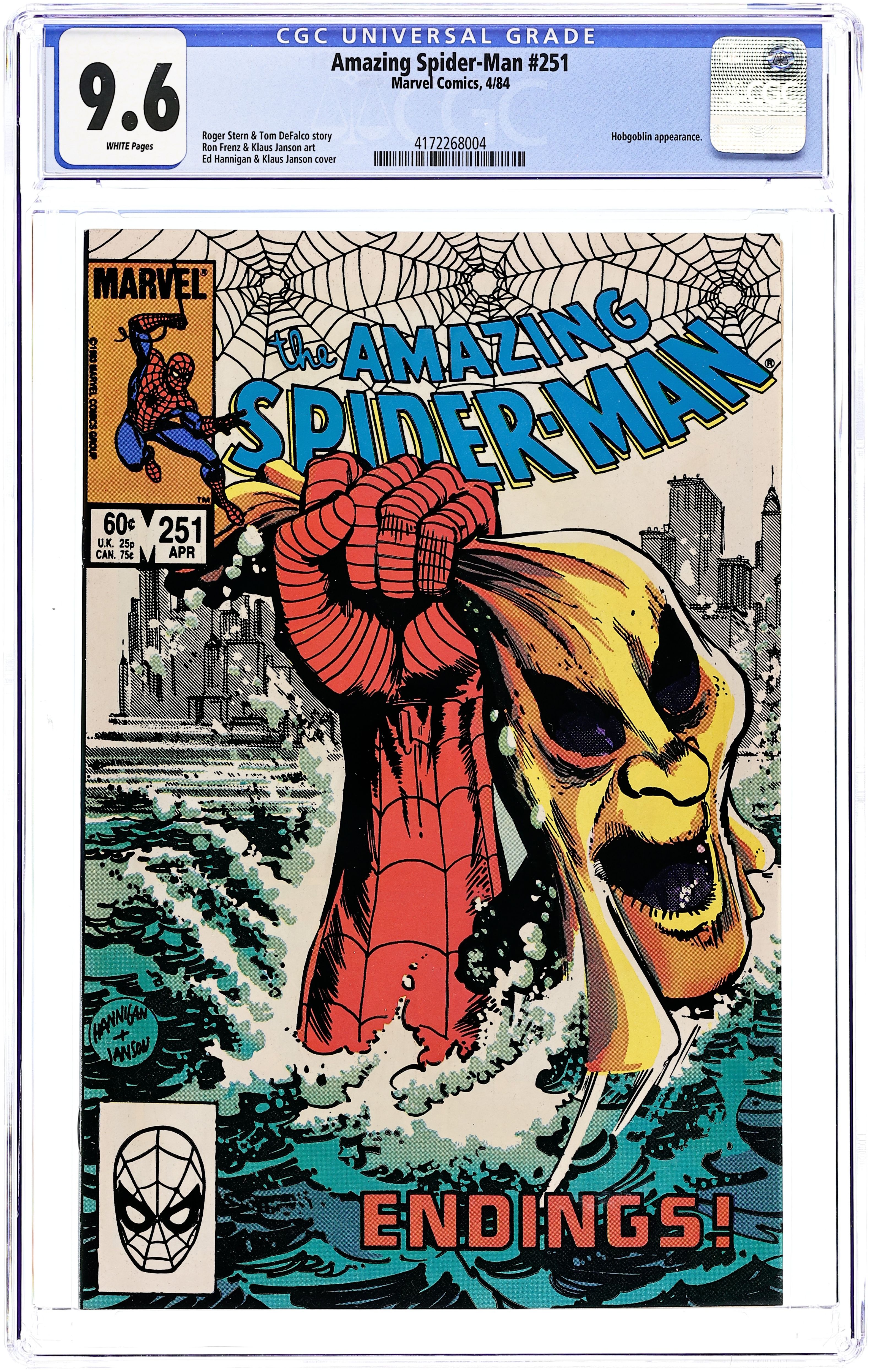 Direct Edition. "Endings!" Part 3 of 3. Plot by Roger Stern. Script by Tom DeFalco. Art by Ron Frenz (breakdowns) and Klaus Janson (finishes). Cover by Ed Hannigan and Klaus Janson. After a pumpkin bomb sets his hideout ablaze, the furious Hobgoblin drives away in his battle van! But unbeknownst to the goblin, the web-slinger is holding on for dear life underneath! When Spider-Man crawls inside...the ferocious fight begins! As the Hobgoblin and the wall-crawler trade blows, the battle van careens into the Hudson River! Is the Hobgoblin going to sleep with the fishes? Only time will tell. Several hours later Spider-Man is drawn towards a mammoth citadel in Central Park...and then suddenly disappears! Cameo appearances by Harry Osborn, J. Jonah Jameson and Joe Robertson. (Notes: The Hobgoblin returns briefly in Amazing Spiderman 255. Tom DeFalco begins his 3-year run as the writer of the Amazing Spider-Man title. Likewise, Ron Frenz begins his 3-year run as the primary penciler. This issue includes a full-page ad for the first Marvel Super Heroes Secret Wars Limited Series (where the web-slinger appears next). This three-part story was reprinted in Marvel Tales 259, 260, and 261.)36 pgs. Cover price $0.60. Grade: CGC 9.6 explanation of grade Condition: Used (collectible)