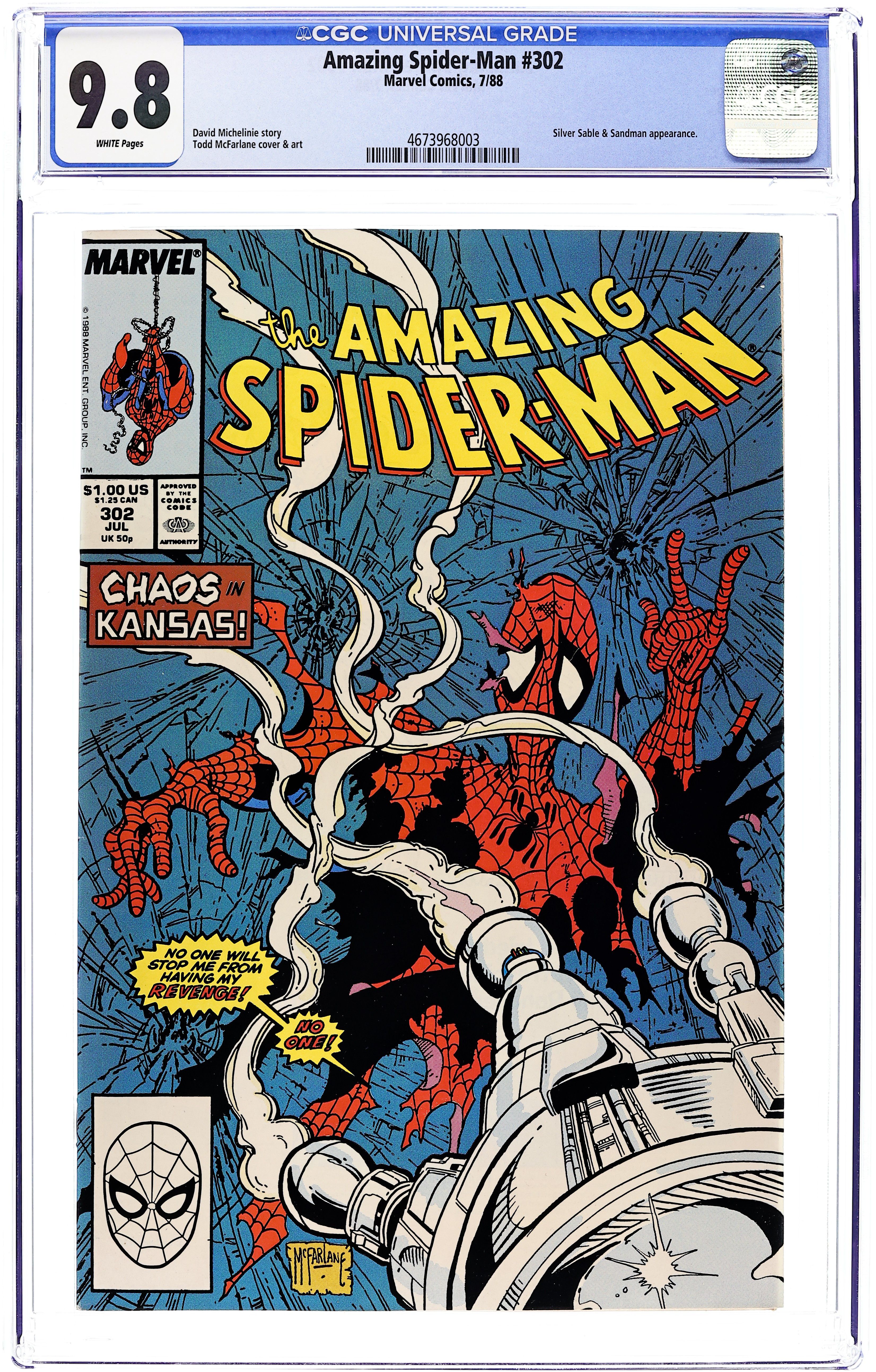 Direct Edition. "(Mid) American Gothic!" Script by David Michelinie. Art by Todd McFarlane. Cover by Todd McFarlane. Peter Parker receives a job offer from a high tech company in Kansas! So, Spider-Man's alter-ego travels to America's heartland to tour the company's facilities! But upon arrival Peter discovers that there's something rotten in the sunflower state! Good thing the web-slinger made the trip too! Cameo appearances by Mary Jane Watson, Silver Sable, and the Sandman. (Note: This issue includes a full-page ad for the Evolutionary War saga that ran through Marvel's 1988 annuals.) 36 pgs. Cover price $1.00. Grade: CGC 9.8 explanation of grade Condition: Used (collectible)