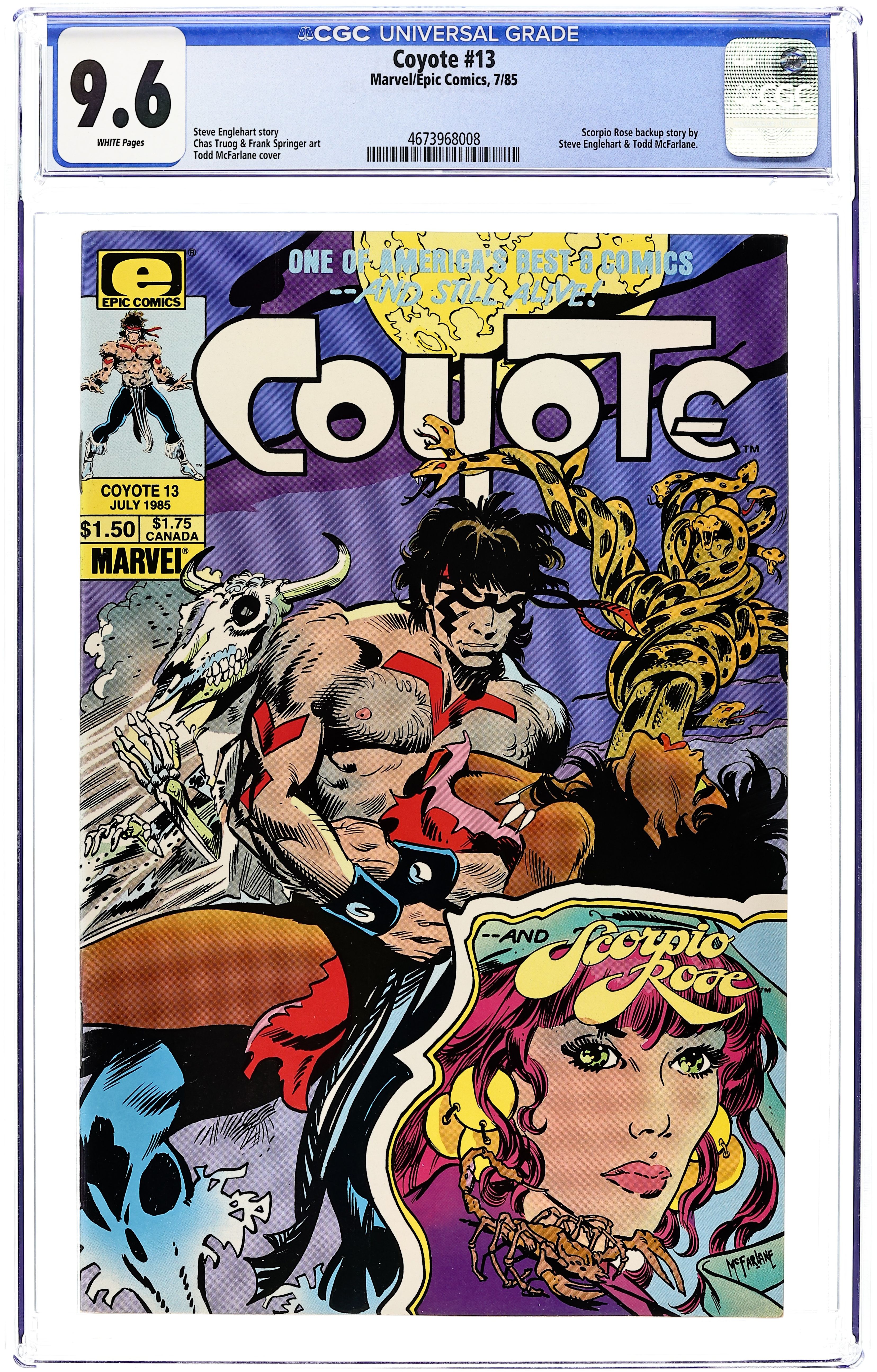 "Snakes Alive!" Written by Steve Englehart. Art by Chas Truog and Frank Springer. OK, Tally's not dead, but she's still a werecoyote - so Coyote has to summon up some supernatural help to turn her back to normal. But there are forces on both sides of reality who don't want her changed. Plus, "Scorpio Rose: Part 2 of 3!" Written by Steve Enlehart. Art by Todd McFarlane. Rose and her friends face the fiend from beyond the stars for the sake of an unborn child - only to lose one of their own. 32 pages, FC. Mature Readers Cover price $1.50. Grade: CGC 9.6 explanation of grade Condition: Used (collectible)