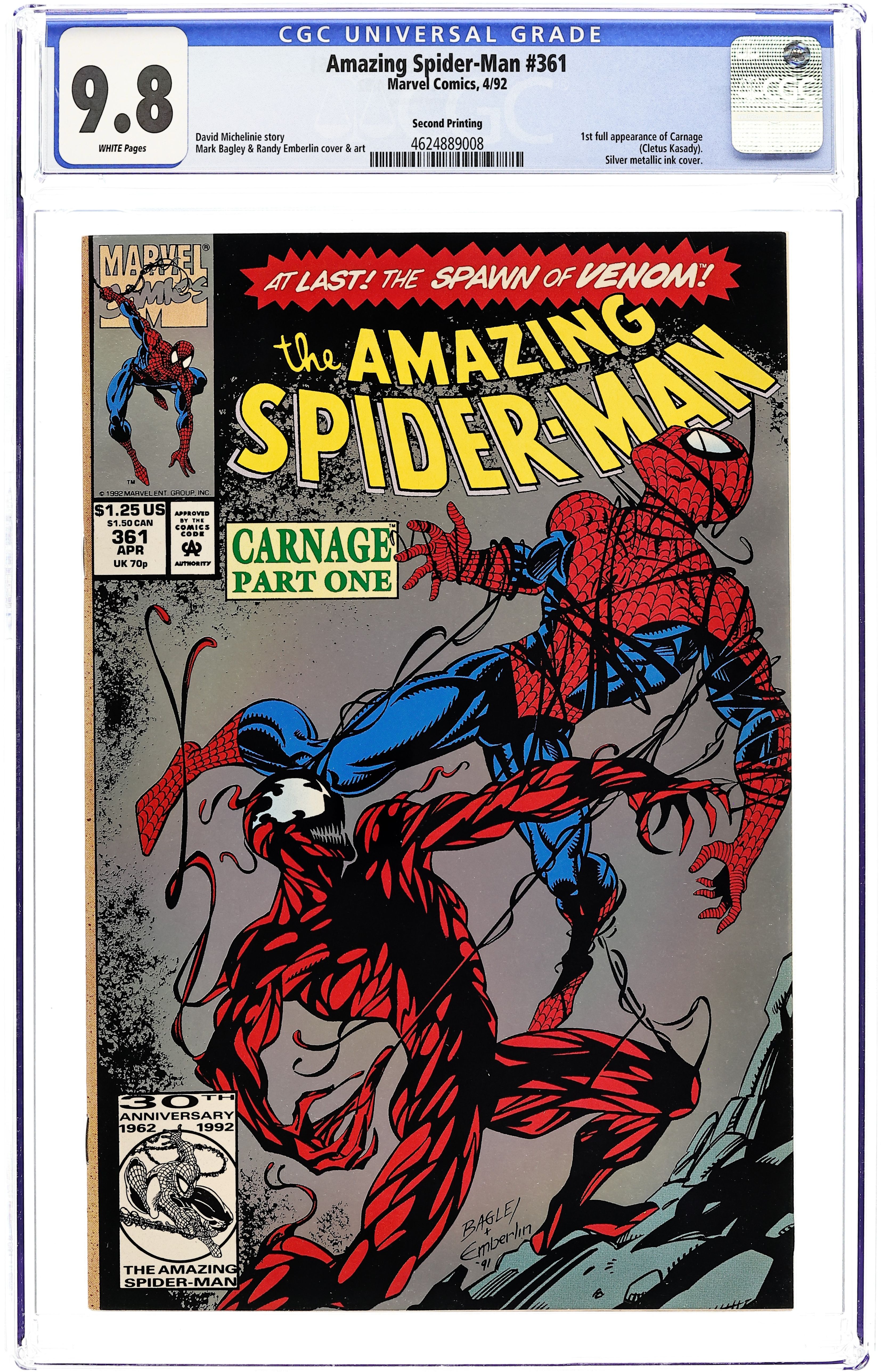 Second Printing (silver ink background, not white); 1st full app Carnage in "Savage Genesis!" Pt. 1 of 3. Script by David Michelinie. Pencils by Mark Bagley. Inks by Randy Emberlin. Cover by Mark Bagley and Randy Emberlin. Blood runs in the streets as a serial killer roams New York City! And as the web-slinger investigates the murders, he notices a very disturbing similarity to another killer's modus operandi! In a burned-out building in Brooklyn, the spectacular one comes face-to-face with his new homicidal foe...Carnage! Can the wall-crawler end Cletus Kasady's rampage in their very first encounter? Cameo appearances by Aunt May and Mary Jane Watson. Flashback cameo by Venom. 36 pgs. Cover price $1.25. Grade: CGC 9.8 explanation of grade Condition: Used (collectible)