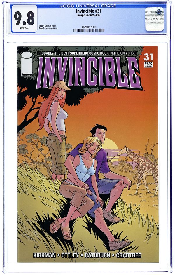 Written by ROBERT KIRKMAN. Art & cover by RYAN OTTLEY & BILL CRABTREE. As things slowly return to normal following the cataclysmic events in the recently completed "A Different World" story arc, Mark takes his girlfriend, Amber, to Africa to visit Atom Eve. February 22 ? 32 pg ? FC ? $2.99 Cover price $2.99. Grade: CGC 9.8 explanation of grade Condition: Used (collectible)