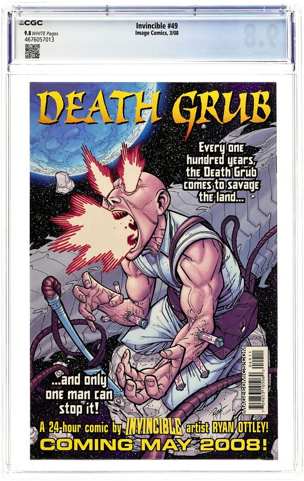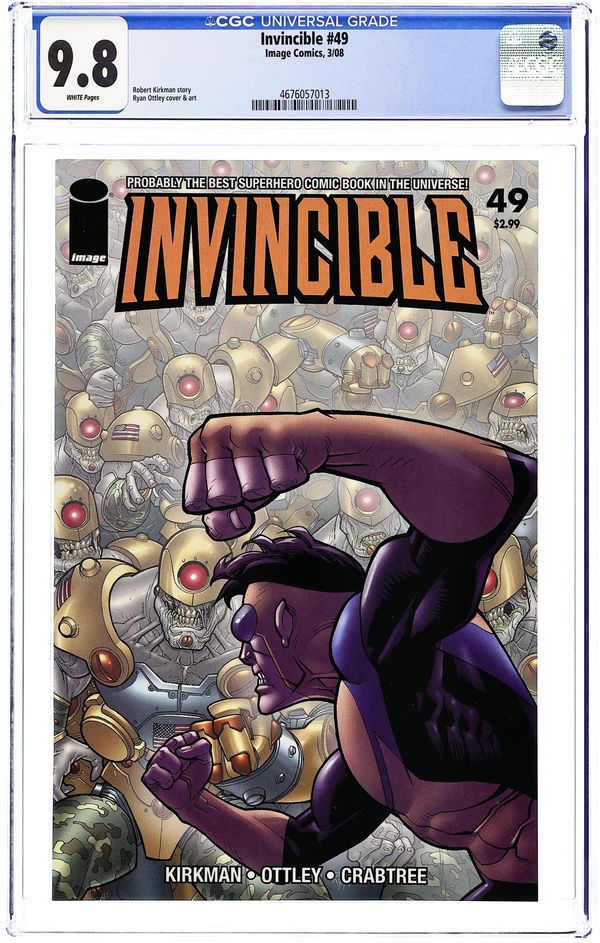 Written by Robert Kirkman. Art by Ryan Ottley and Bill Crabtree. Cover by Ryan Ottley and Val Staples. The Reanimen are back, but now they're fighting for the good guys?! And if that's the case, why are they facing off against Invincible? It all comes to a head here! Events are set in motion leading up to our big issue 50 -- coming next month! Plus: Pin-ups of Invincible and Omni-Man by Rob Hough. 28 pages, full color. Cover price $2.99. Grade: CGC 9.8 explanation of grade Condition: Used (collectible)