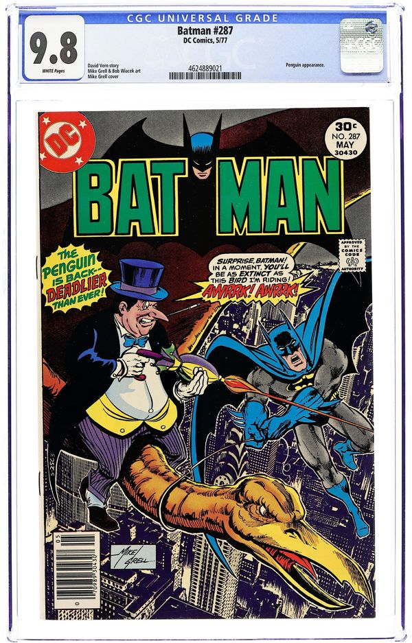 Last 30-cent cover price. Cover art by Mike Grell. The Maltese Cup Cake Hostess snack cakes ad with Wonder Woman. "Batman-Ex--As in Extinct!", script by David Vern (as David V. Reed), pencils by Mike Grell, inks by Bob Wiacek; The Penguin uses robots of extinct birds or ancestors of birds, starting with a robot pterosaur, top commit crimes; The robot cracks out of a Napoleon statue at Gotham's La Galerie; Batman destroys the robot bird, but Penguin and his gang pull off a jewel robbery; Penguin sends an archeopteriz robot to panic the crowds at Gotham City Music Hall where a movie about Machiavelli is playing; Meanwhile, his gang robs a diner on 1805 Hamilton Street; Batman captures the crooks, but then learns of an attack on the schooner Nelson by a robot Diatryma. Statement of ownership; Average # of copies sold previous year: 178,000. Text article with photograph of publisher Jenette Kahn. Walt Simonson profile by Mike Gold. 36 Pages, Full Color. Cover price $0.30. Grade: CGC 9.8 explanation of grade Condition: Used (collectible)