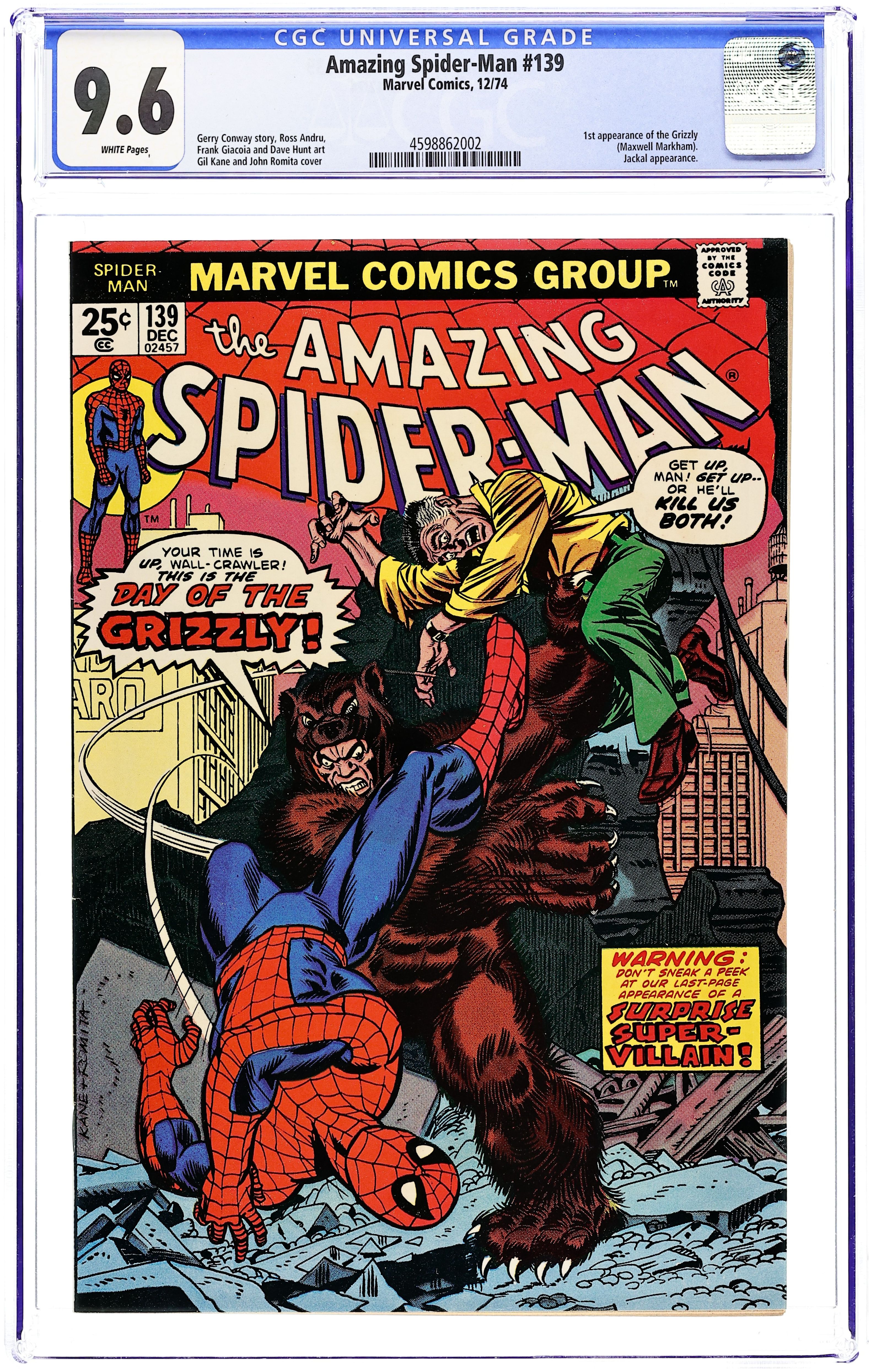 "Day of the Grizzly!" Part 1 of 2. Script by Gerry Conway. Pencils by Ross Andru. Inks by Frank Giacoia and Dave Hunt (backgrounds). Cover by Gil Kane (pencils) and John Romita Sr. (inks). Peter Parker finds a new place to live at 410 Chelsea Street! And when he stops by the Daily Bugle to tell his friends...the Grizzly attacks! Whoa, were did this 9-foot super-villain come from? There's no time for questions or answers as the web-slinger leaps into action! But the Grizzly is loaded for bear and then some! All the amazing one can do is save J. Jonah Jameson while the Grizzly escapes! However courtesy of the Jackal, the rematch is coming next issue! First appearance of the Grizzly. Cameo appearances by Betty Brant, Liz Allan, and Joe Robertson. (Notes: The letters page includes Marvel Value Stamp series A #42 Man-Wolf by Gil Kane and Mike Esposito. This story was reprinted in Marvel Tales 116.) 36 pages. 25c cover price. Cover price $0.25. Grade: CGC 9.6 explanation of grade Condition: Used (collectible)