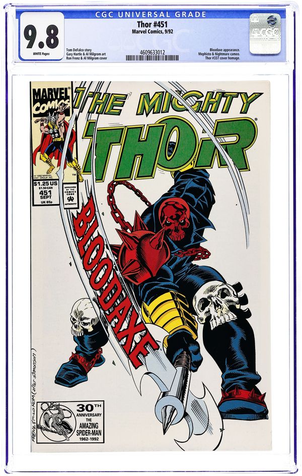 Cover pencils by Ron Frenz, inks by Al Milgrom. "Beware the Bloodaxe," script by Tom DeFalco, pencils by Gary Hartle, inks by Al Milgrom and Yates; Thor and Code Blue return to Earth from Asgard and are joined by Balder and Sif; Bloodaxe kills two gang members. Brief appearances by Odin, Fandral, Volstagg, Sif, and Mephisto. Tales of Asgard back-up, "Enter The Nameless Dimension," script by Tom DeFalco, art by Geof Isherwood; Enchantress escapes Karnilla's dungeon to rescue Heimdall and ends up trapped by Nightmare. Bullpen Bulletins. 36 pgs., full color. $1.25. Cover price $1.25. Grade: CGC 9.8 explanation of grade Condition: Used (collectible)