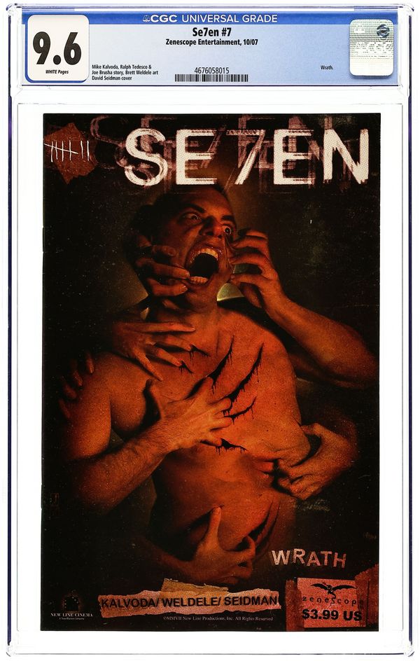 By Mike Kalvoda, Brett Weldele, and David Seidman. John Doe is ready to complete his masterpiece and leave behind a legacy that will not soon be forgotten. As he writes his last journal entry, the final chapter reveals insights into the life he lived before his transformation. In that life, before he became John Doe, he knew all about sin. And none better than Wrath. And because of his past he already knows the decision young Detective Mills will make when confronted with his own rage. It is the same decision John Doe made years ago when Wrath overcame him. A decision that ends in death and leads to his self appointment as mankind's modern day savior. Don't miss the final issue in this landmark series from Zenescope Entertainment. Cover price $3.99. Grade: CGC 9.6 explanation of grade Condition: Used (collectible)