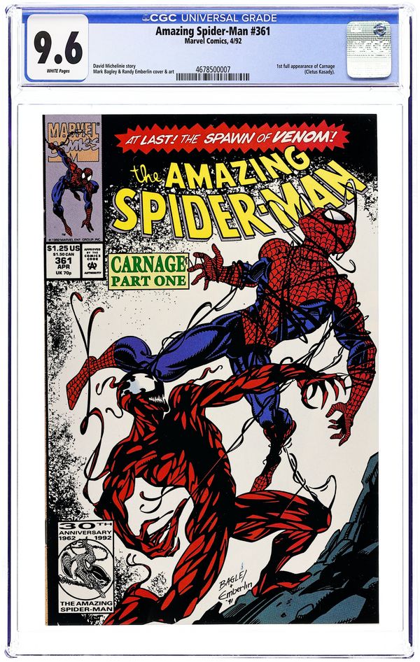 First Printing. Direct Edition. First (full) appearance of Carnage in "Savage Genesis!" Part 1 of 3. Script by David Michelinie. Pencils by Mark Bagley. Inks by Randy Emberlin. Cover by Mark Bagley and Randy Emberlin. Blood runs in the streets as a serial killer roams New York City! And as the web-slinger investigates the murders, he notices a very disturbing similarity to another killer's modus operandi! In a burned-out building in Brooklyn, the spectacular one comes face-to-face with his new homicidal foe...Carnage! Can the wall-crawler end Cletus Kasady's rampage in their very first encounter? Cameo appearances by Aunt May and Mary Jane Watson. Flashback cameo by Venom. (Note: This three-part story was reprinted in 2011 in the trade paperback: Spider-Man -- The Vengeance of Venom.) 36 pages, full color. $1.25 cover price. NOTE: Most of these were distributed with slight printer tears in the bottom edge of the cover. Cover price $1.25. Grade: CGC 9.6 explanation of grade Condition: Used (collectible)