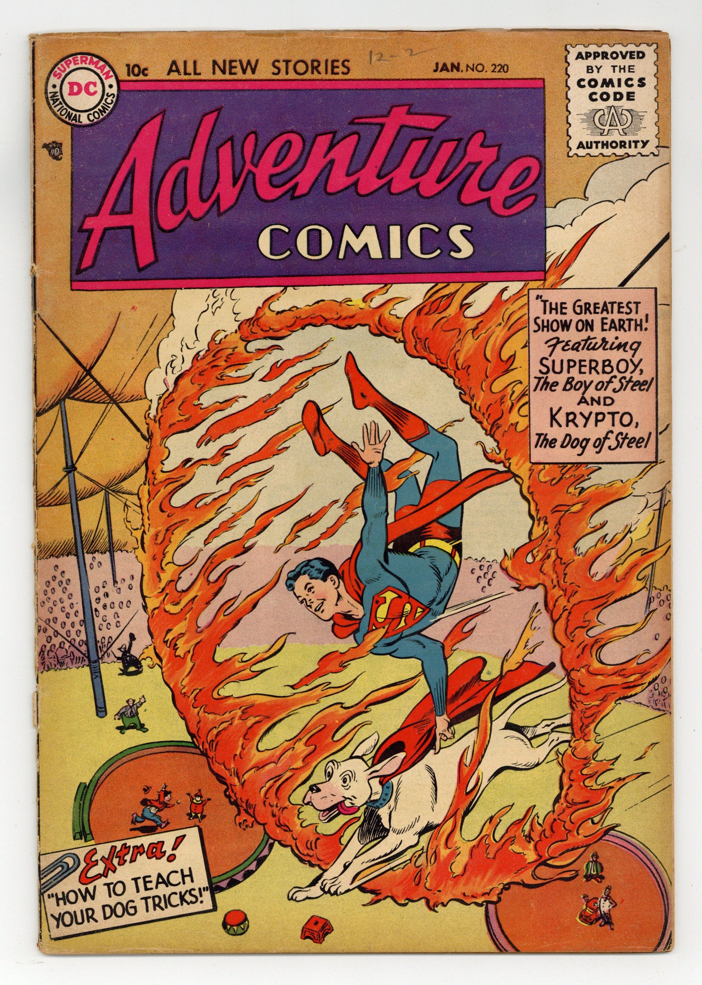 Cover pencils by Curt Swan, inks by Stan Kaye. The Greatest Show On Earth, script by Otto Binder, pencils by Curt Swan, inks by George Klein; Superboy and Krytop perform in a circus; KIrypto's existence is revealed to the world. The Coward and the Hero starring Aquaman, script by Jack Miller, art by Ramona Fradon. Superman Puzzle Game. How to Teach Your Dog Tricks article. The Arrows From Outer Space starring Green Arrow, art by George Papp. Little Pete humor page by Henry Bolitnoff. 36 pages, Full Color. Cover price $0.10. Grade: VG- 3.5 explanation of grade Condition: Used (collectible)